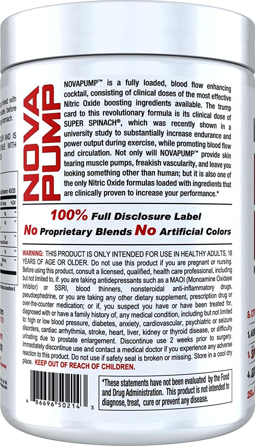 - NITRIC OXIDE PRE WORKOUT | With a massive 8,000mg dose of Citrulline Malate coupled with SUPER SPINACH, one can expect skin tearing muscle pumps. CAFFEINE FREE & STACKABLE | NOVAPUMP is void of caffeine or any stimulants, making it perfectly stackable with any pre workout powder on the market. SUPER SPINACH | NOVAPUMP contains the clinical dose of SUPER SPINACH, which was recently shown in a university study to substantially increase endurance and power output during exercise, while promoting bl