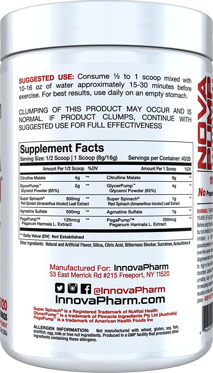 NovaPump is a cutting-edge vasodilator and nitric oxide pre workout supplement scientifically formulated to throttle performance and amplify muscle pumps. Conventional pump pre workouts rely on a rather "standard" mix of citrulline, arginine, and glycerol to boost nitric oxide production and enhance blood flow. While this offers an adequate solution to pumps and performance, "adequate" is not in InnovaPharm's vocabulary. To create a truly one-of-a-kind pump pre workout, we invested countless hours in R&D to create a formula that is innovative, and, above all, effective! NovaPump attacks the problem of increasing blood flow from multiple fronts to create a formula that results in unabated nitric oxide production, blood flow, and muscle pumps. NovaPump is 100% free of banned substances, and can be taken by any athlete, weightlifter, or casual gym rat (male or female) seeking improved performance, reduced fatigue, and of course, bigger, nastier, longer-lasting muscle pumps. NovaPump contains NO stimulants and can be used on its own or stacked with your favorite stimulant-inclusive pre workout such as Limitless or NovaRage Xtreme. It's perfect for those late night training sessions when you want a boost in performance but don't want to deal with the disrupted sleep. NovaPump is also great for those times you may be cycling off stimulants all together. Regardless, NovaPump is your anytime, anywhere pump pre workout solution. Benefits of NovaPump At-A-Glance Enhances nitric oxide production Boosts power output Promotes greater blood flow Improves nutrient delivery to working muscles Fatigue resistance Supports cardiovascular health Limits arginase activity Supports healthy blood pressure.