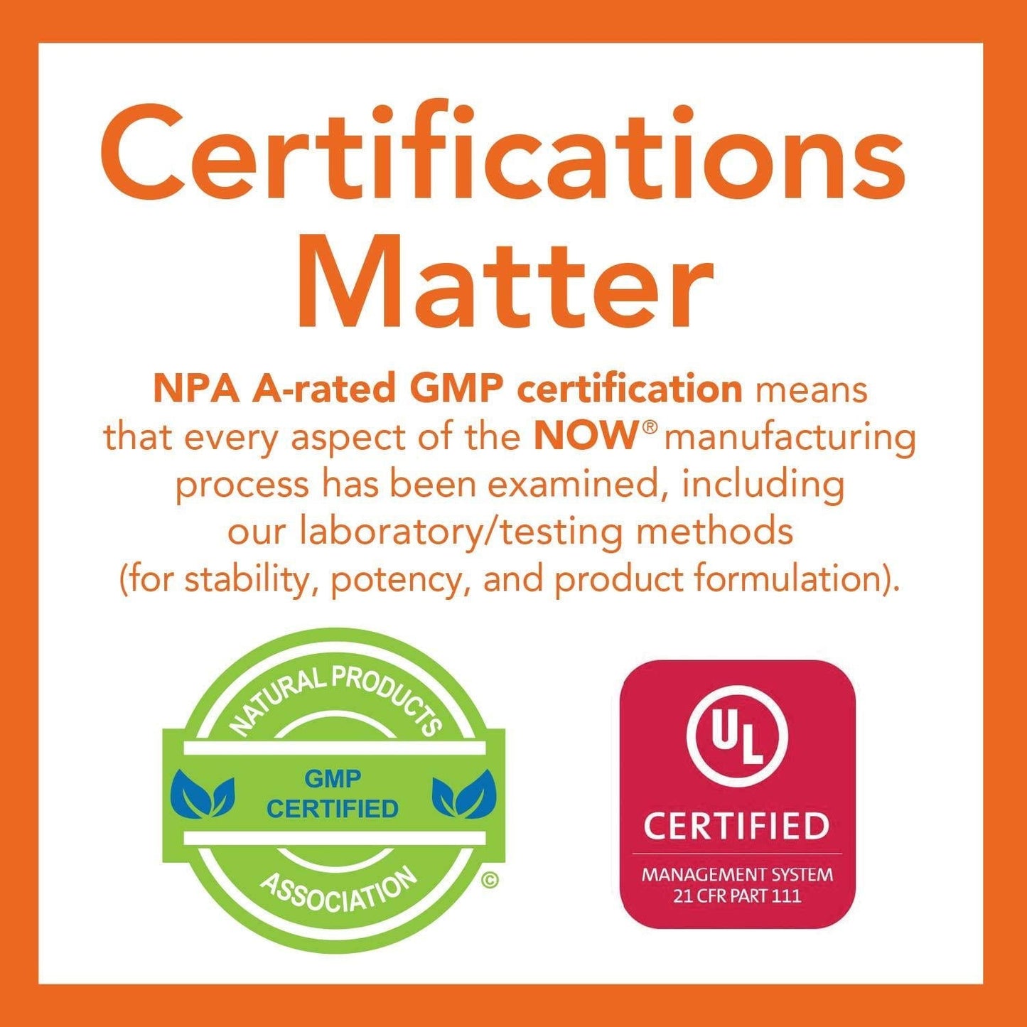 - GMP Quality Assured: NPA A-rated GMP certification means that every aspect of the NOW manufacturing process has been examined, including our laboratory/testing methods (for stability, potency, and product formulation).