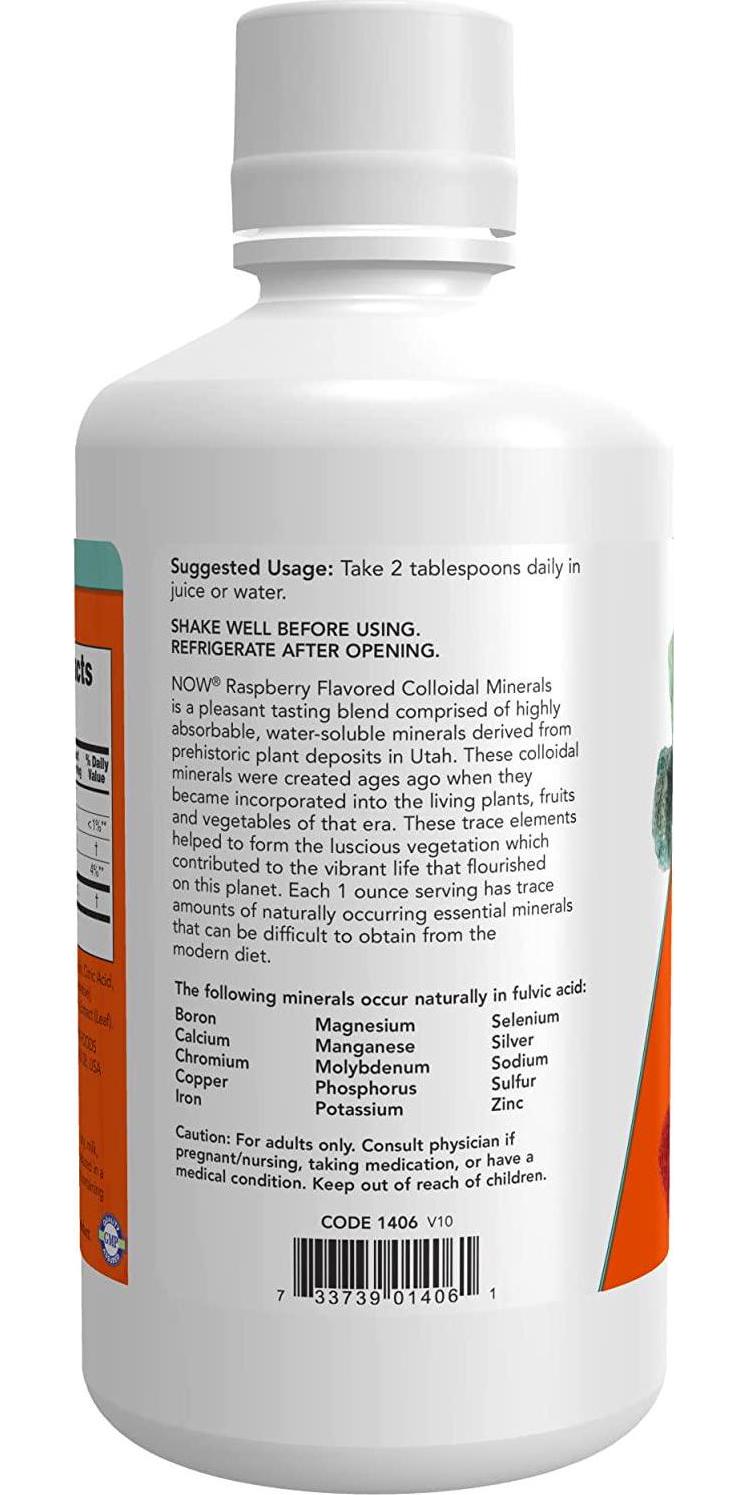 NOW Raspberry Flavored Colloidal Minerals is a pleasant tasting blend of highly absorbable, water-soluble minerals derived from prehistoric plant deposits in Utah. Each 1 ounce serving contains trace levels of many major and trace minerals.These colloidal minerals were created ages ago when they became incorporated into the living plants, fruits and vegetables of that era.These trace elements helped to form the luscious vegetation which contributed to the vibrant life which flourished on this planet.