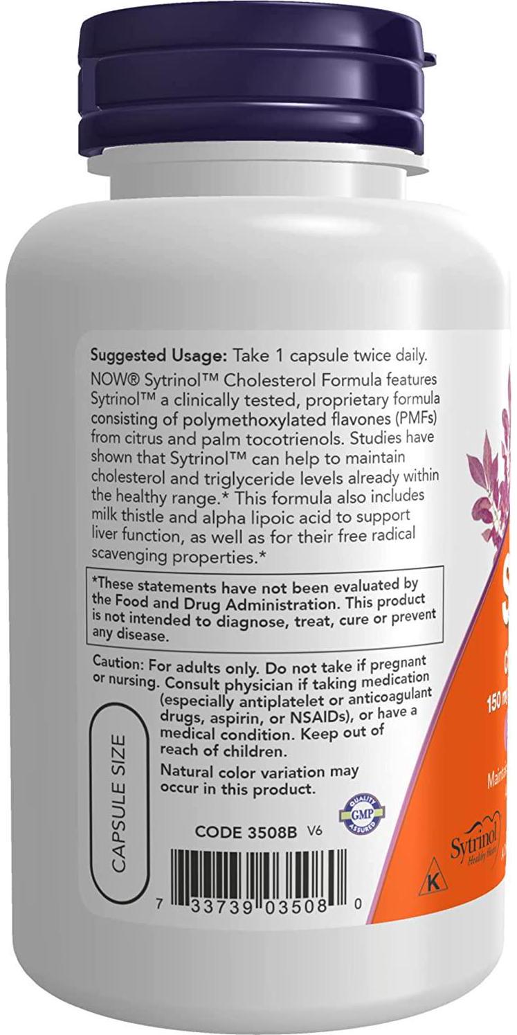 NOW Sytrinol Cholesterol Formula contains the patented and clinically tested ingredient, Sytrinol. Sytrinol is a proprietary formula consisting of polymethoxylated flavones (PMF's) from citrus, palm tocotrienols and other proprietary constituents. Studies have shown that Sytrinol helps maintain cholesterol and triglyceride levels already within the healthy range. NOW Sytrinol Cholesterol Formula also contains Policosanol, a blend of long-chain fatty alcohols (LCFA) derived from sugar cane for its synergistic effect. In addition, Milk Thistle and Alpha Lipoic Acid have been included for their antioxidant effects, as well as to support liver health. This combination of ingredients makes NOW Sytrinol Cholesterol Formula an ideal supplement for naturally supporting overall cardiovascular function.Read more about Cardio Health from Your Health Professor