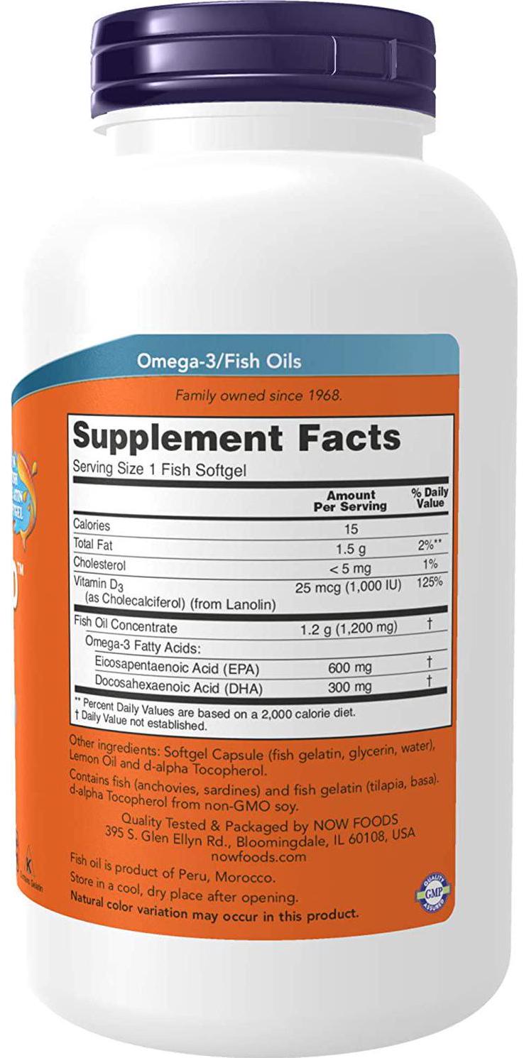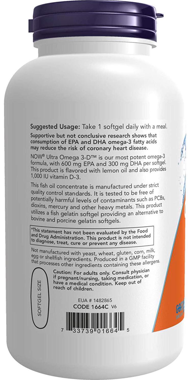NOW Foods - Ultra Omega 3-D - 180 Softgels NOW Ultra Omega 3-D is their most potent Omega-3 formula, with 600 mg EPA and 300 mg DHA per softgel. This product is flavored with lemon oil and also provides 1,000 IU Vitamin D-3. From the FDA's website: The natural fish oil concentrate used in this softgel is manufactured under strict quality control standards. It is tested to be free of