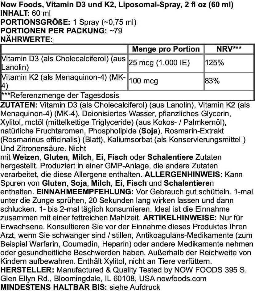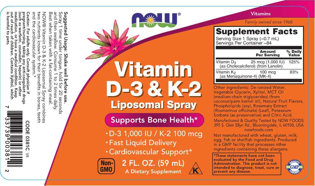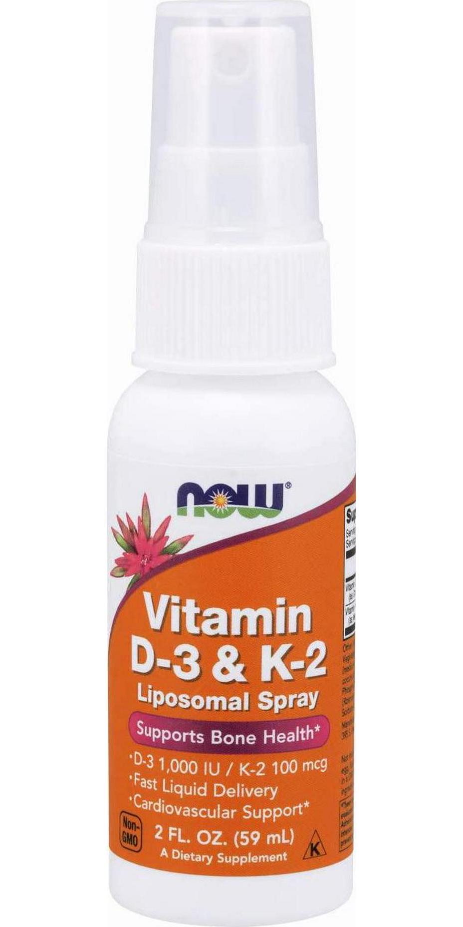 NOW Food Vitamin D-3 & K-2 Liposomal Spray - 2 oz. (60 ml) NOW combines two nutrients extensively researched for their benefits for bones, teeth and the cardiovascular system. Vitamin D3 promotes calcium absorption and calcium transport to bones.Vitamin K2, wise has been shown to be critical for bone and cardiovascular health through its role in the support of proper calcium