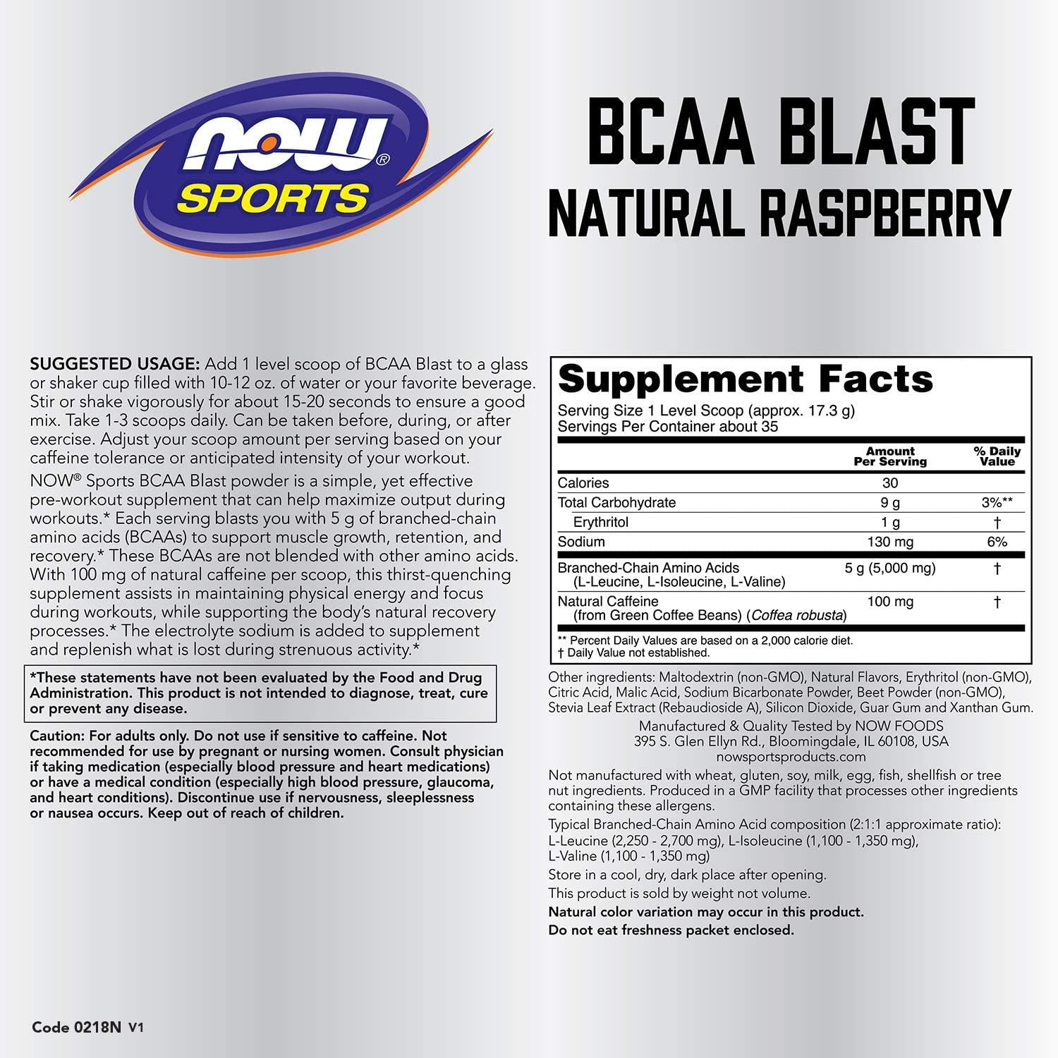 NOW Sports Nutrition, BCAA Blast Powder, 5 g BCAA, 100 mg Caffeine, Raspberry, 600-Grams