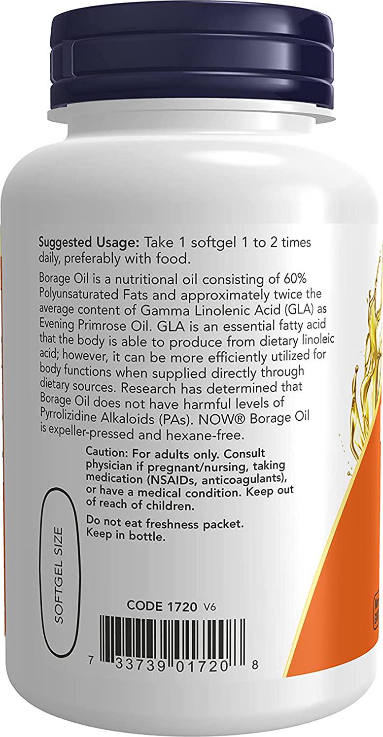 Borage oil is a nutritional oil consisting of 60% polyunsaturated fats and approximately twice the average content of gamma linolenic acid (GLA) as evening primrose oil. GLA is an essential fatty acid that the body is able to produce from dietary linoleic acid; however, it can be more efficiently utilized for body functions when supplied directly through dietary sources. Research has determined that borage oil does not have harmful levels of pyrrolizidine alkaloids (PAs). NOW Borage Oil is expeller-pressed and hexane-free. Natural color variation may occur in this product. Take 1 softgel 1 to 2 times daily, preferably with food.