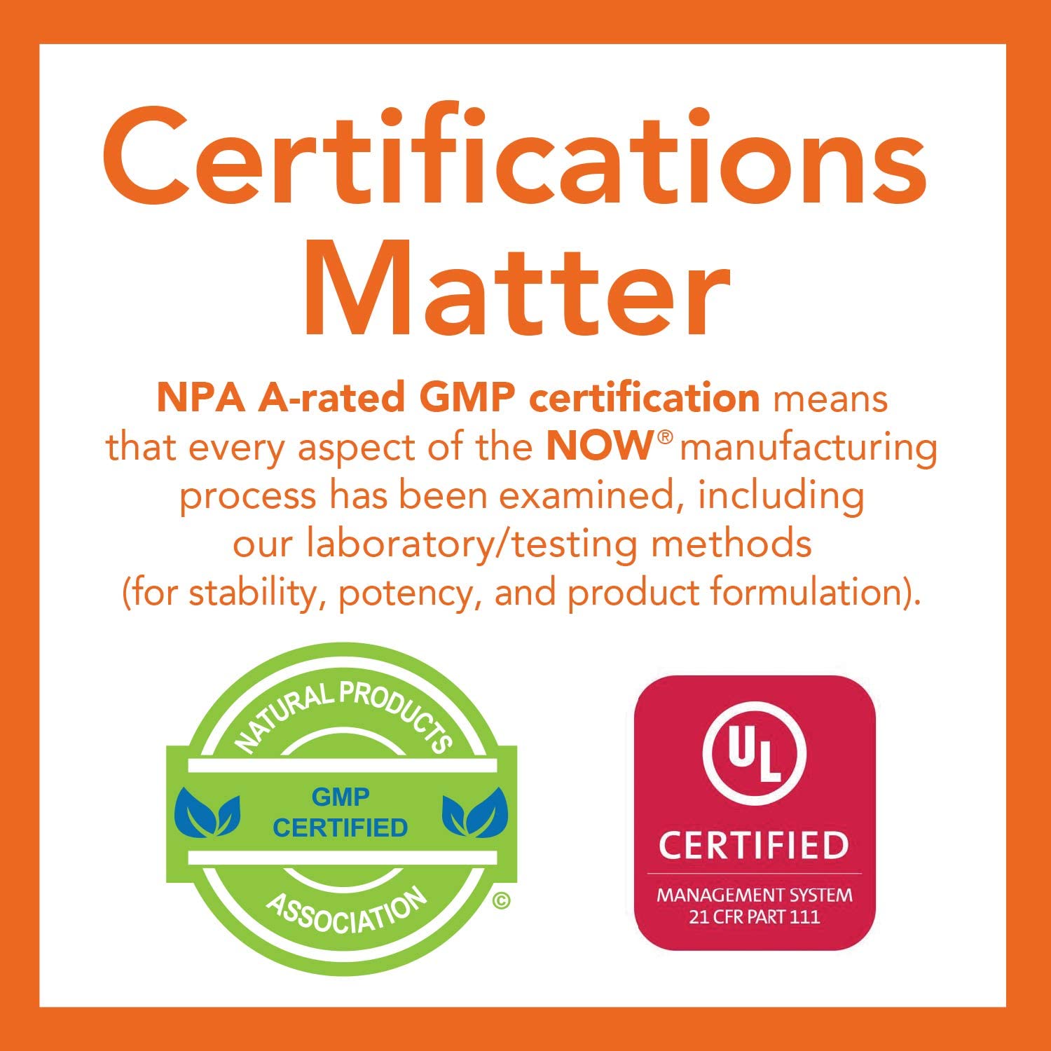 - GMP Quality Assured: NPA A-rated GMP certification means that every aspect of the NOW manufacturing process has been examined, including our laboratory/testing methods (for stability, potency, and product formulation).
