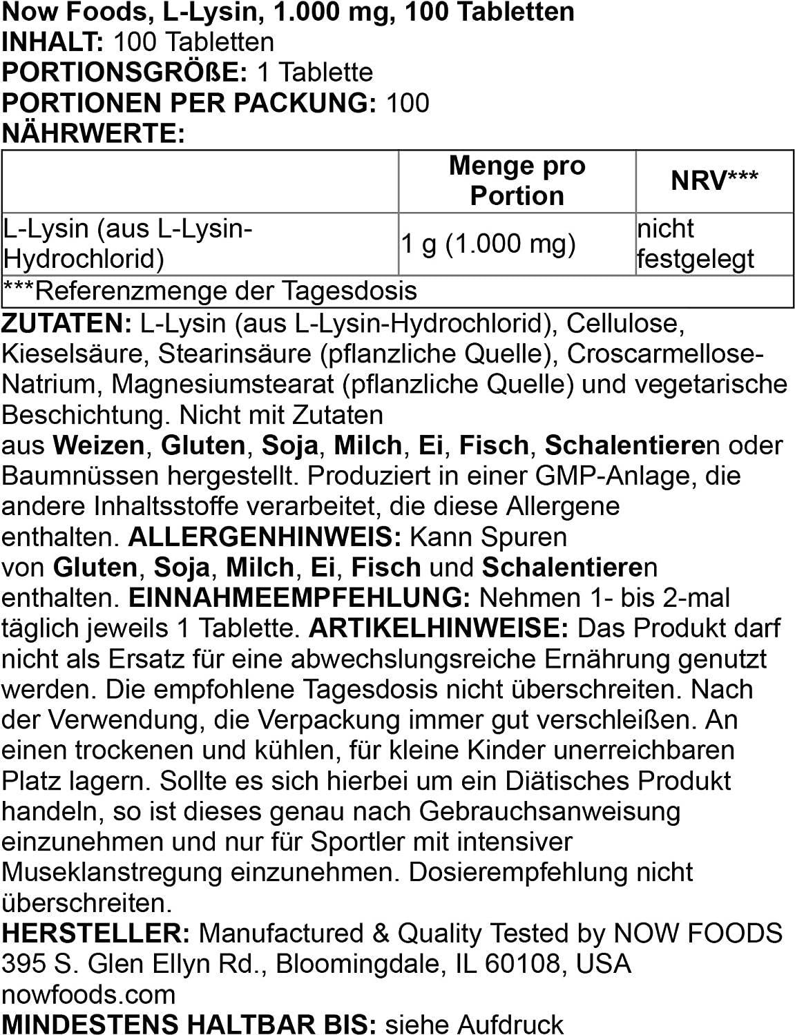 NOW Supplements, L-Lysine (L-Lysine Hydrochloride) 1,000 mg, Double Strength, Amino Acid, 100 Tablets
