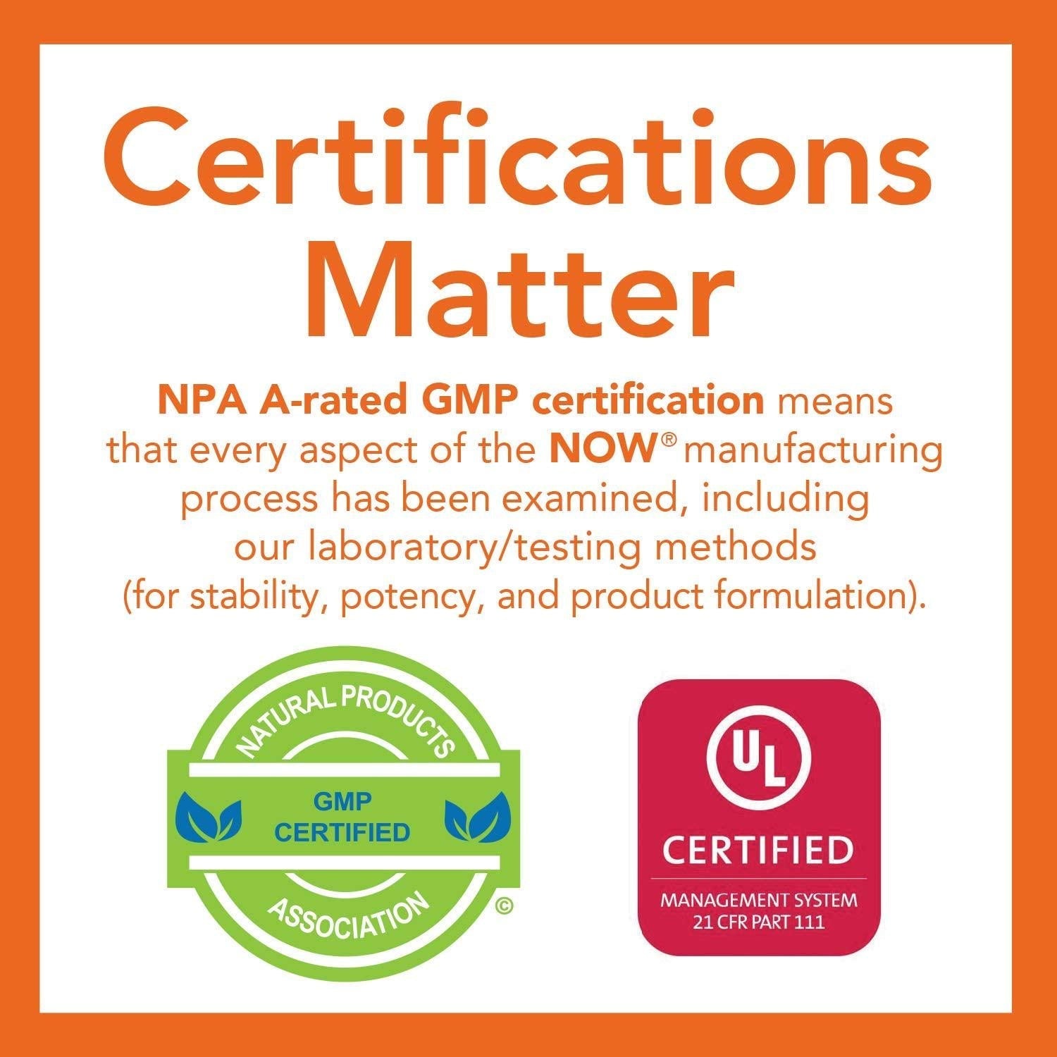 - GMP quality assured: NPA A-rated GMP certification means that every aspect of the NOW manufacturing process has been examined, including our laboratory/testing methods (for stability, potency, and product formulation).