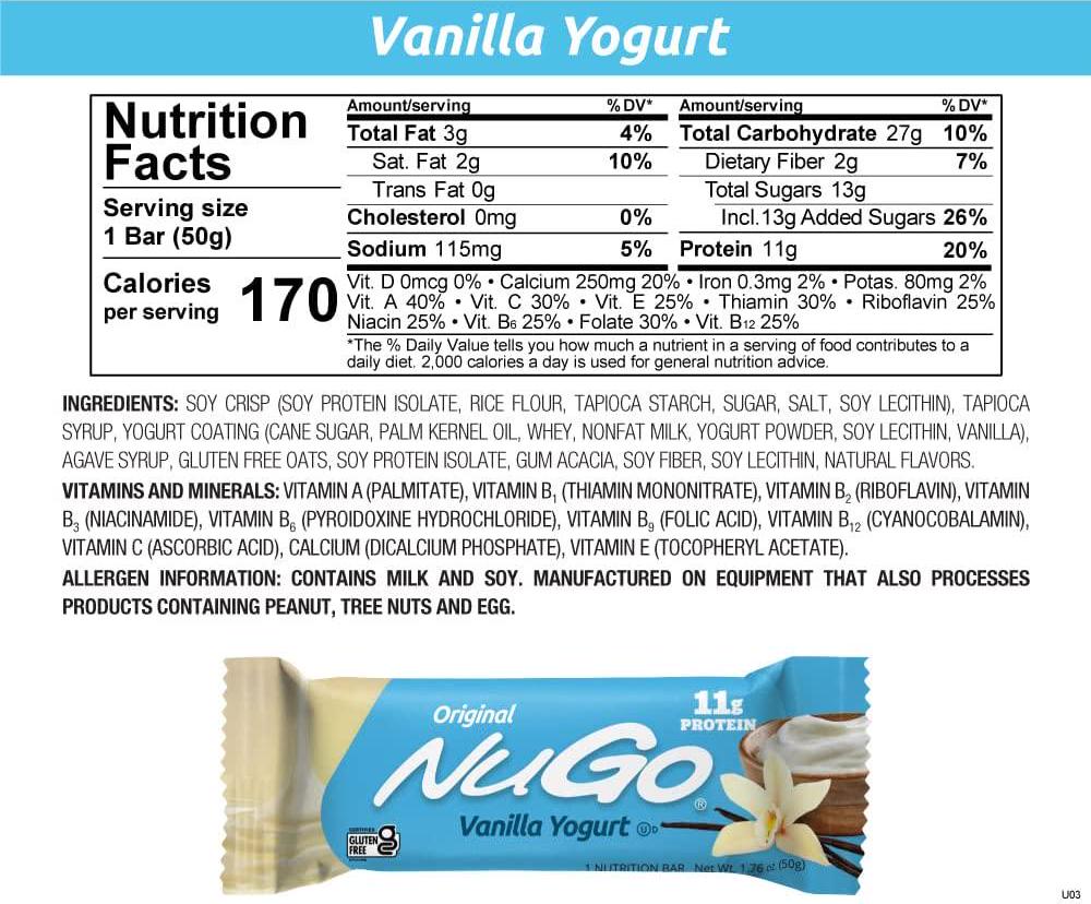 Smooth, creamy vanilla yogurt makes this flavor a real treat. Light and crispy, this snack is a sure hit for the family. This certified gluten free and low-glycemic bar is low in fat, high in protein, and loaded with vitamins.Light and crispy, this bar is a sure hit for a family snack. NuGo Family bars are high in protein, low in fat and loaded with essential antioxidants and vitamins.