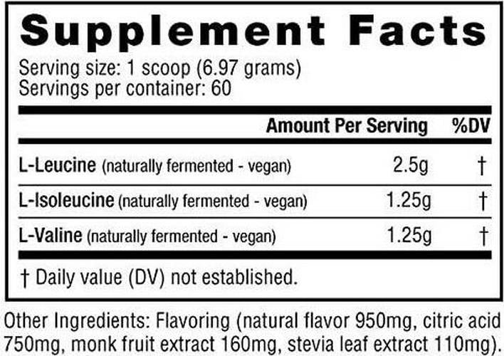 BCAA is a clean, naturally fermented branched chain amino acid mix that helps repair and rebuild muscle during or after intense exercise. BCAA contains the purest amino acids your body needs in an ideal ratio. It is naturally flavored and free of artificial color, flavor, and sweeteners. This is the perfect addition to your routine to help speed up muscle recovery and reduce soreness and fatigue from exercise. Supplement Details per Serving: