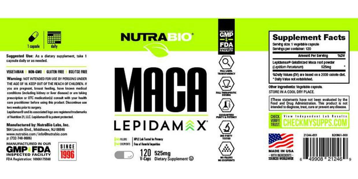 Nutrabio Maca 525mg (Lepidamax) - 120 Vegetable Capsules