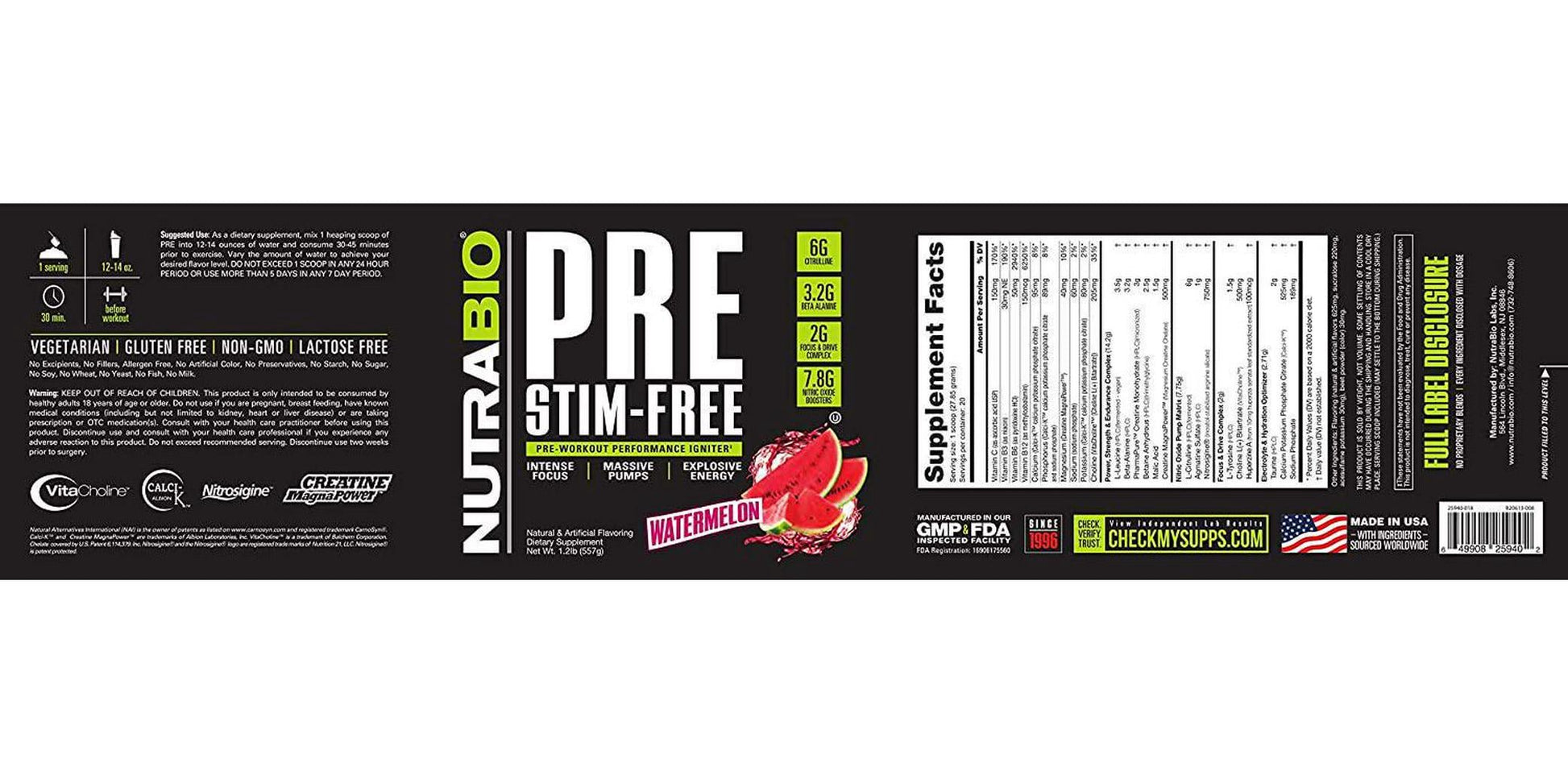 NutraBio pre stim-free, as the name implies, is our stimulant free version of our pre formula. We created pre stim-free for those individuals who are sensitive to ingredients such as Caffeine, Hit the gym late at night, or otherwise want a pre-workout with the performance boosting ingredients found in pre minus the stimulants. To that extent we can say pre stim-free is absolutely the most thorough, effective, and purest stimulant free pre-workout in existence. Pre stim-free is built upon clinically dosed and scientifically backed ingredients proven to maximize workout performance and produce results. Athletes of all levels realize that in order to achieve the most effective training session that strength, endurance, energy production, and focus are a must. A complete stimulant free pre-workout supplement should support all of these benefits. The synergistic combination of ingredients found in pre stim-free help prepare your body physiologically and psychologically by supporting increases in muscular strength, power, and endurance, enhancing the mind-muscle connection, and combatting fatigue. from top to bottom pre stim-free will help keep you training stronger and longer. Take a deeper look into pre stim-free and you will find:.