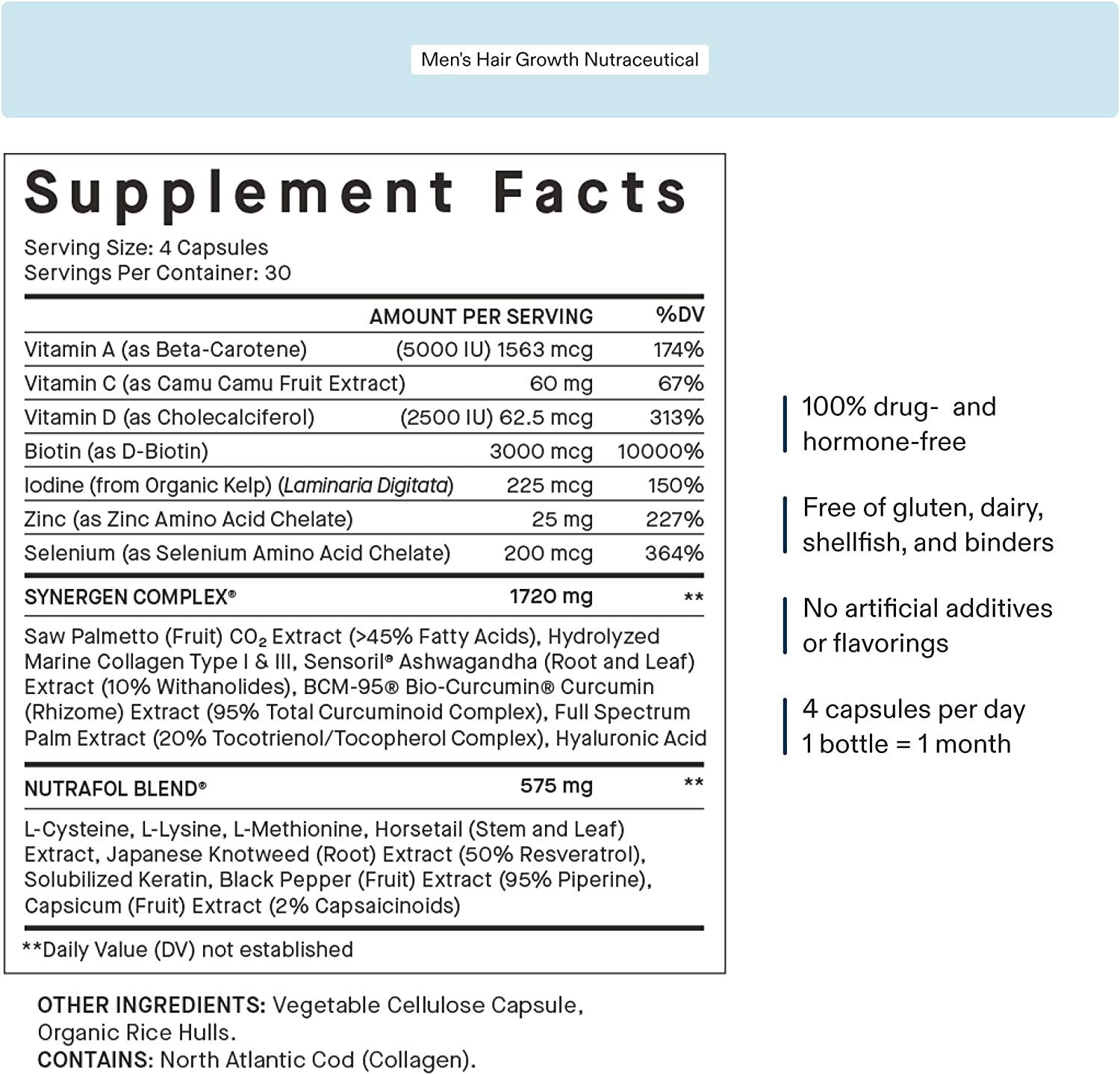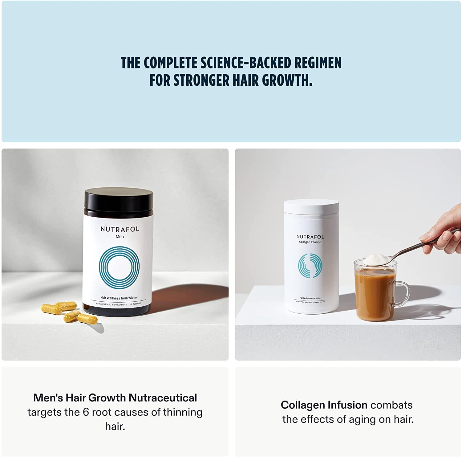 - THE SIMPLE ROUTINE FOR STRONGER HAIR: Just 4 pills per day of Nutrafol Men and 1 scoop of Collagen Infusion in 8oz of hot or cold liquid. Pro tip: Our quick-dissolving, flavorless collagen powder blends right in. Add Collagen Infusion to any liquid—including your morning coffee, tea, or smoothie.