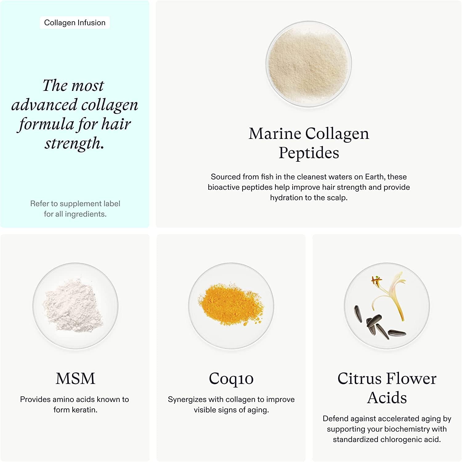 - ADVANCED COLLAGEN FORMULA: Nutrafol Collagen Infusion is a quick-dissolving powder that combats the loss of collagen and elastin in the scalp as you age. Featuring bioavailable Marine Collagen Peptides to replenish key amino acids that build strong hair and provide hydration to the scalp—plus MSM, Coq10, and Citrus Flower Acids for added hair-strengthening benefits.