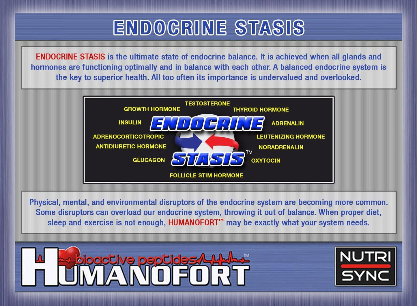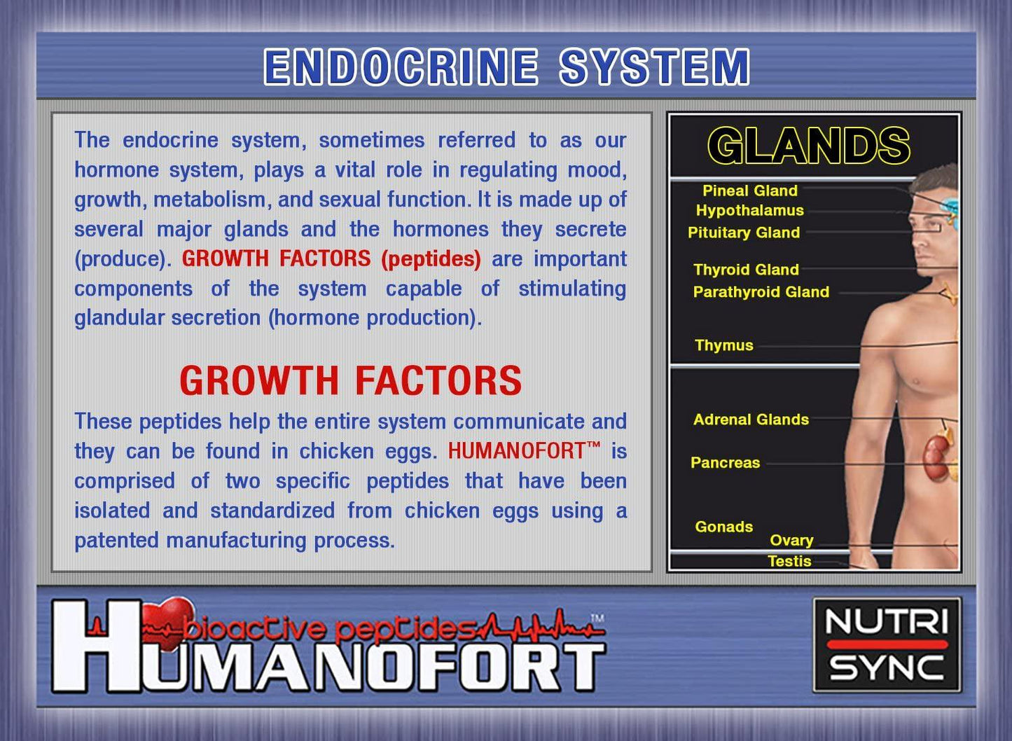 The endocrine system, sometimes referred to as our hormone system, plays a vital role in regulating mood, growth, metabolism, and sexual function. It is made up of several major glands and the hormones they secrete (produce). GROWTH FACTORS (peptides) are important components of the system capable of stimulating glandular secretion (hormone production). These peptides help the entire system communicate and they can be found in chicken eggs. HUMANOFORT is comprised of two specific peptides that have been isolated and standardized from chicken eggs using a patented manufacturing process. IS YOUR ENDOCRINE SYSTEM BALANCED