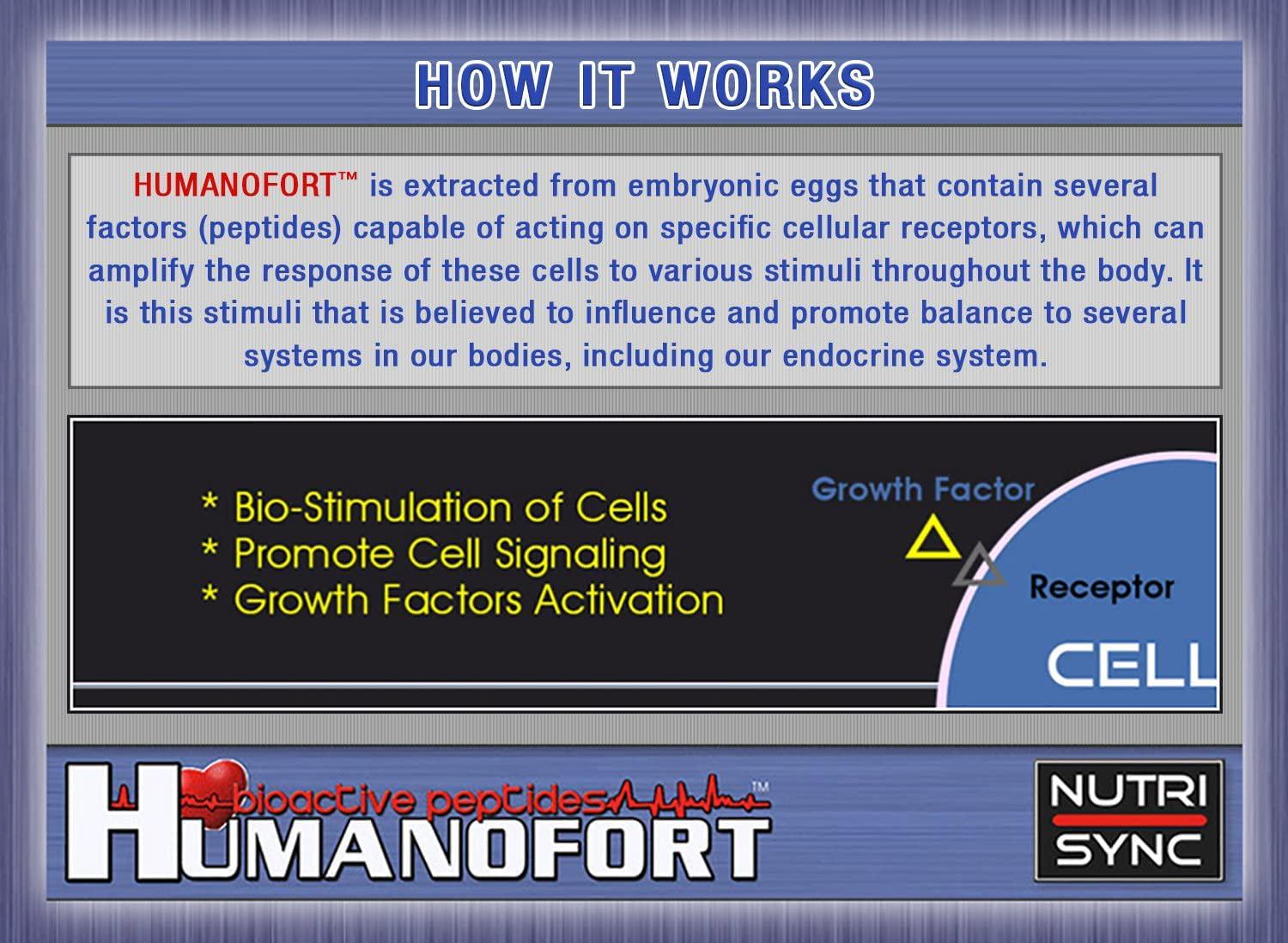 HUMANOFORT is a safe, naturally occurring food extract that contains two specific, standardized bioactive peptides capable of surviving digestion and efficiently entering the bloodstream. The peptides are extracted from chicken embryos using a patented process which guarantees a sterile preparation. HOW IT WORKS