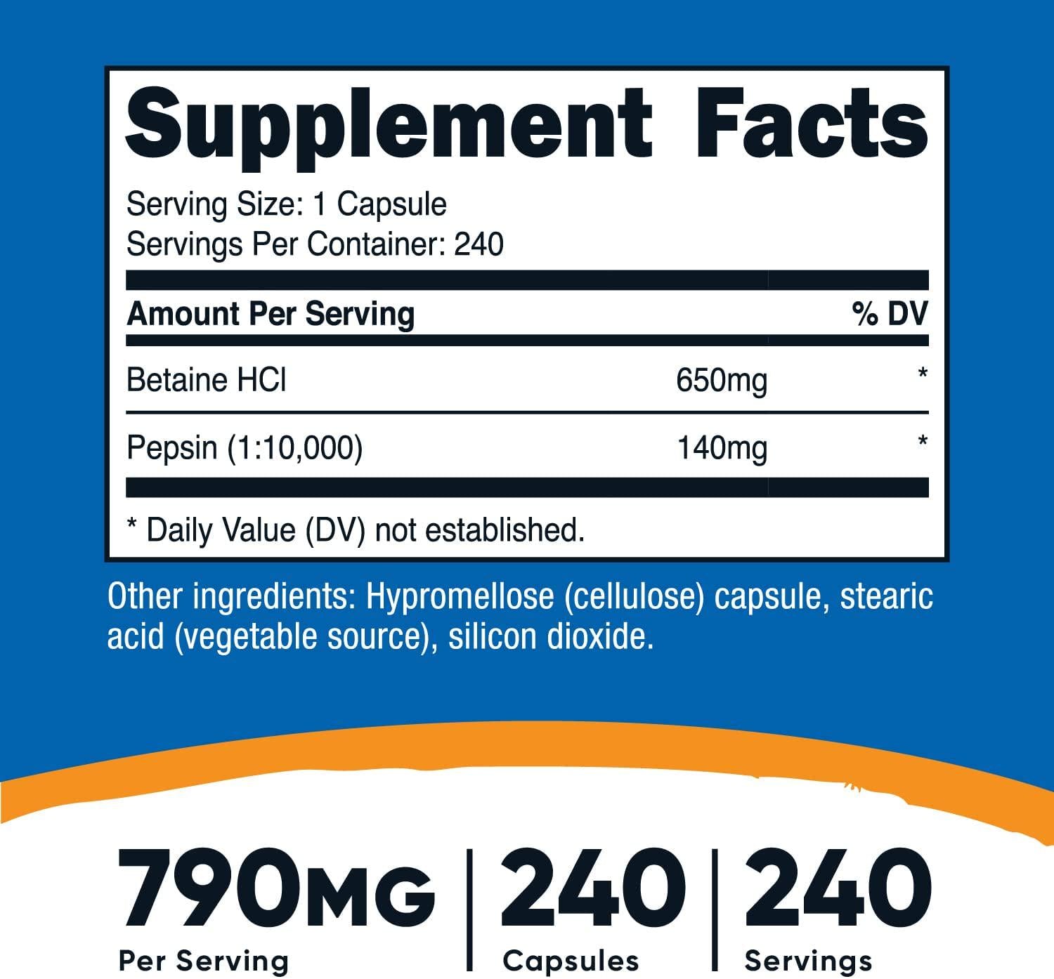 Nutricost Betaine HCl + Pepsin 790mg, 240 Capsules - Gluten Free and Non-GMO