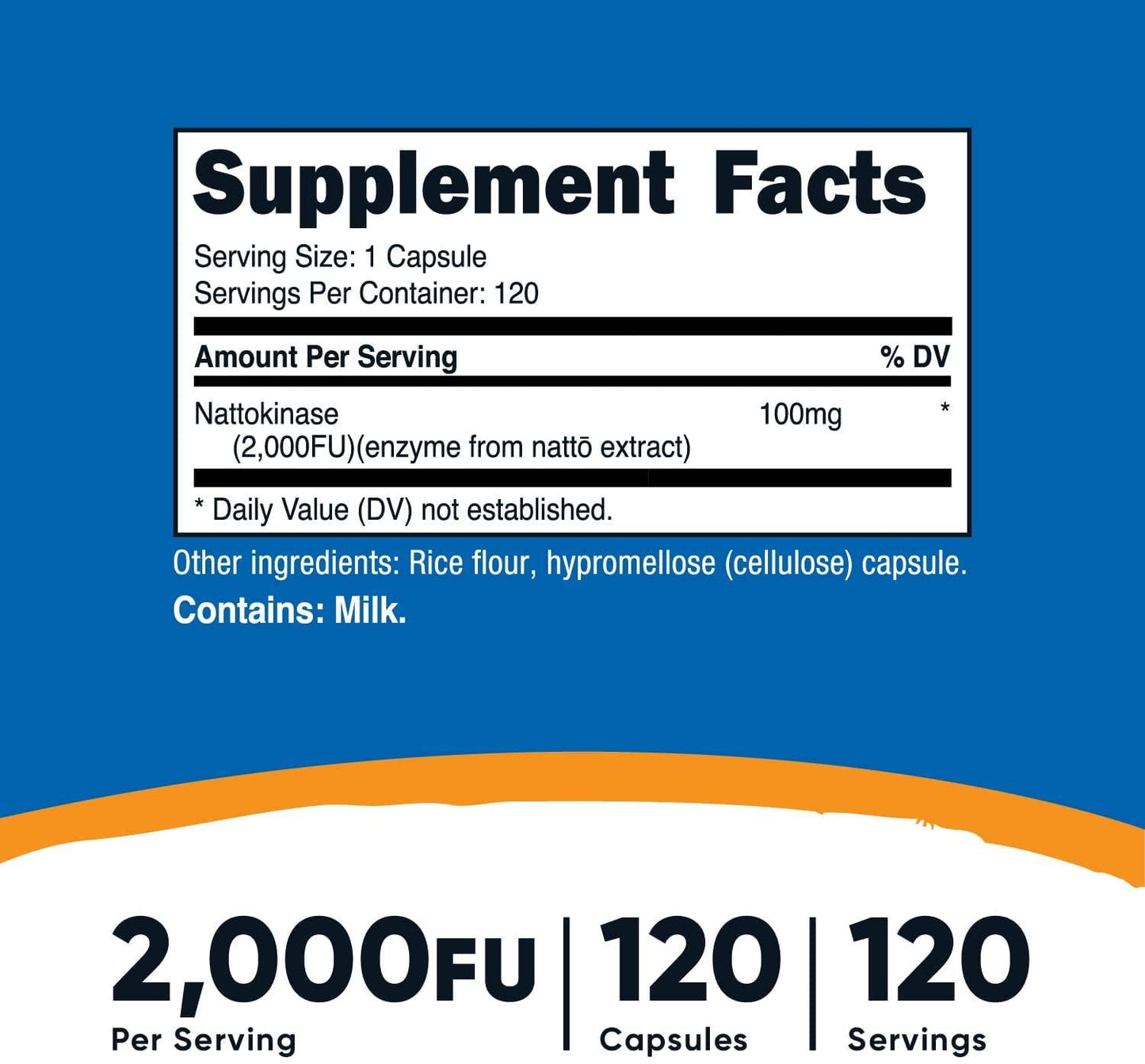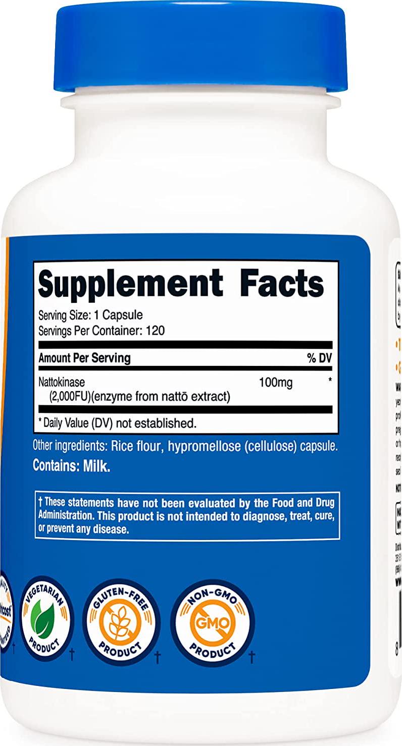 Nutricost's Nattokinase is 2,000FU (Fibrinolytic Units) of Nattokinase per 100mg serving. Each bottle contains 120 capsules and 1 serving is only 1 capsule! This product is vegetarian friendly, non-GMO, gluten free, soy free, and made in a GMP compliant, FDA registered facility.