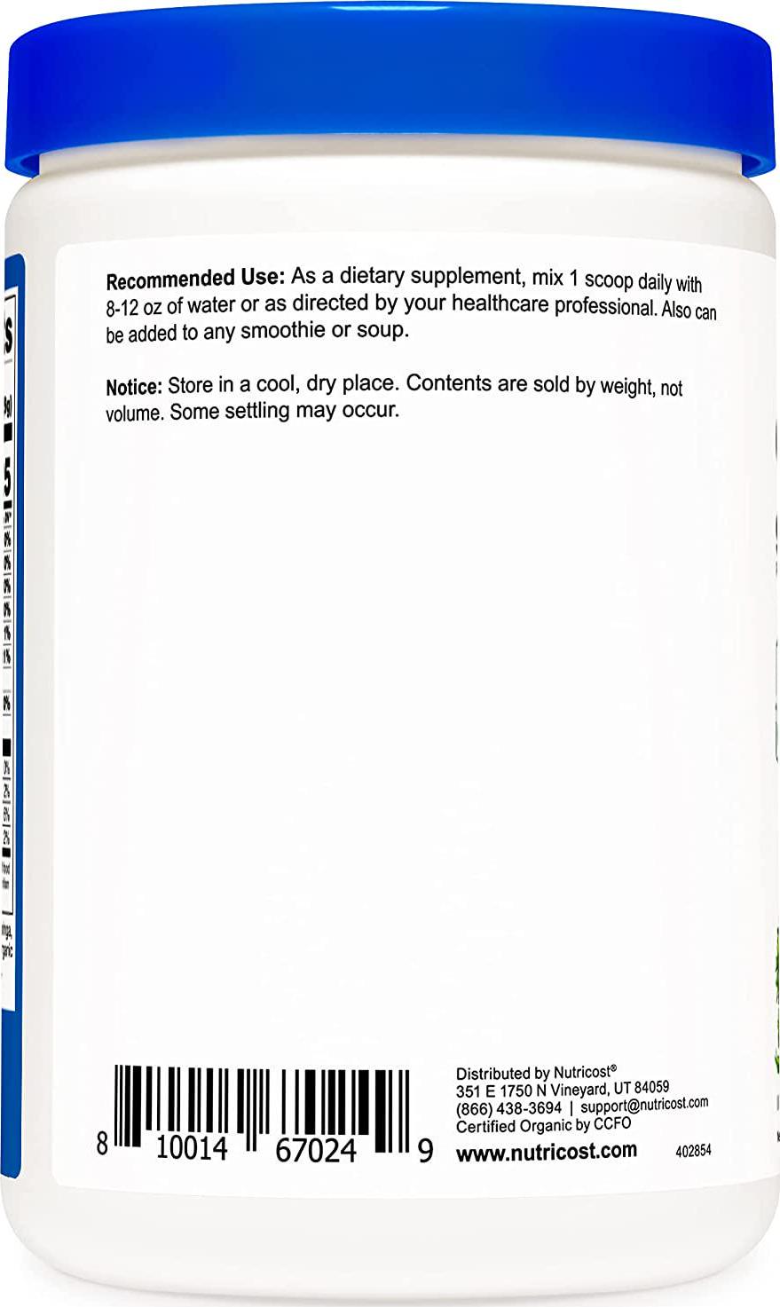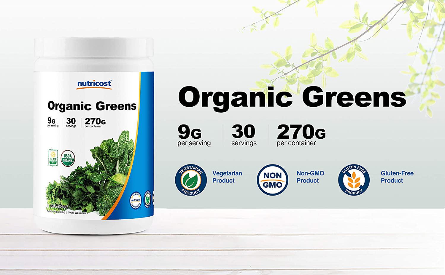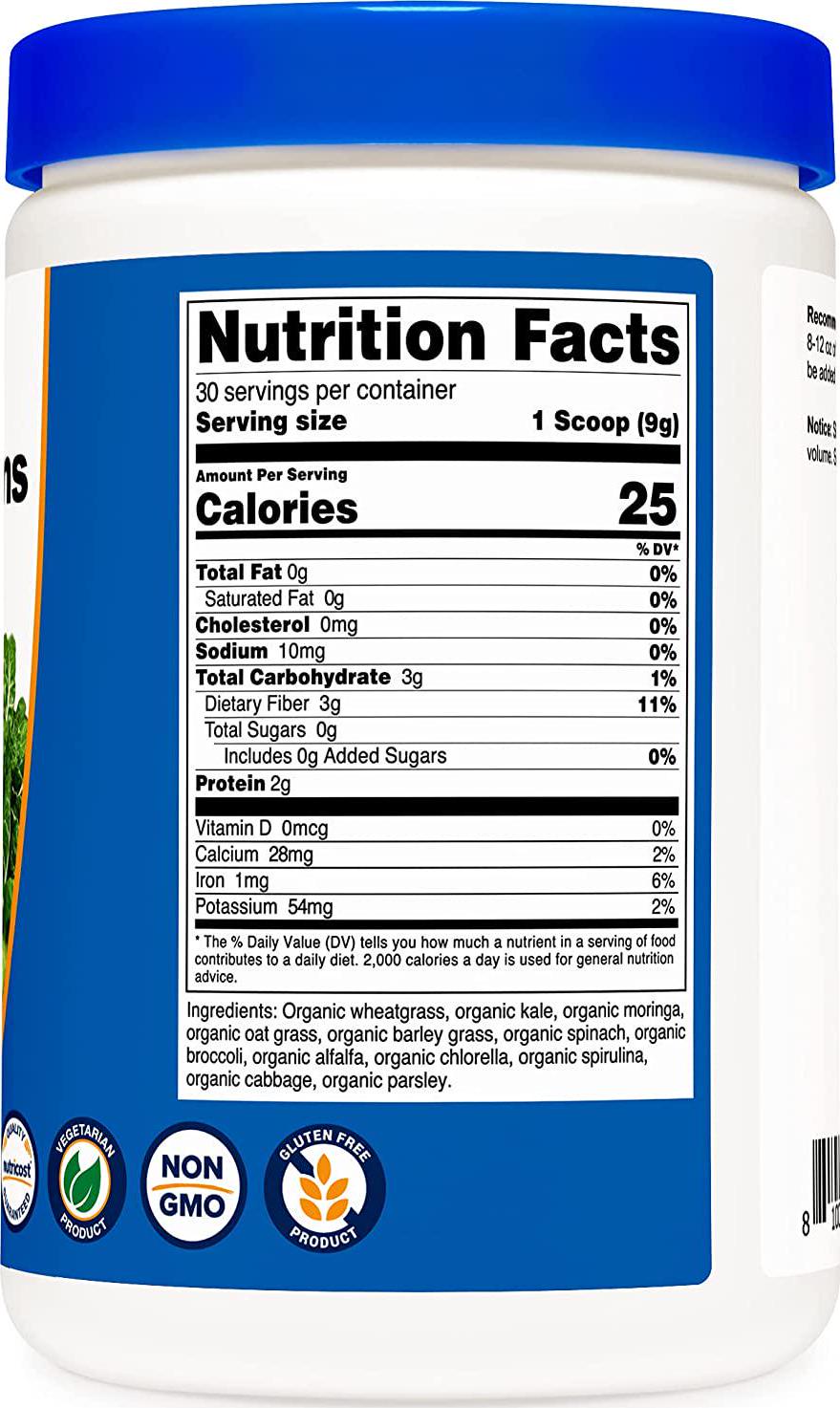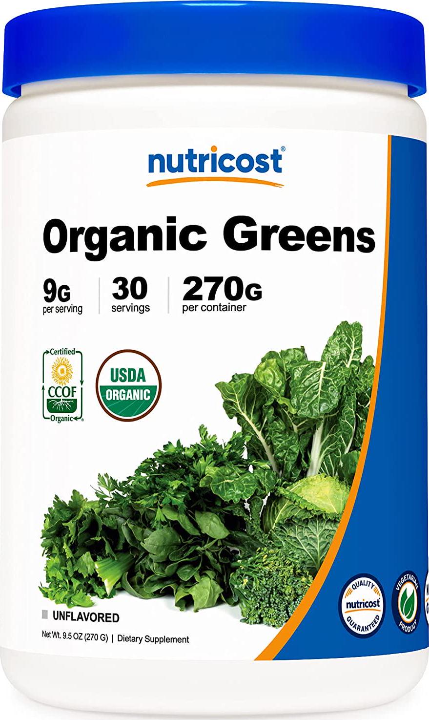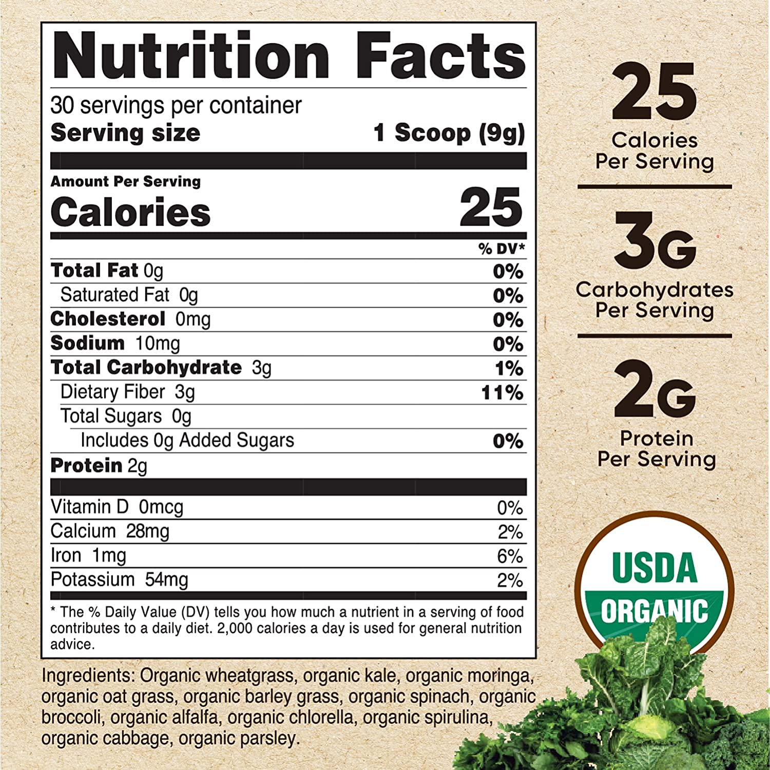 Nutricost Organic Greens provides a premium blend of USDA certified Organic Wheatgrass, Kale, Moringa, Oat Grass, Barley Grass, Alfalfa, Spinach, Broccoli, Chlorella, Spirulina, Cabbage, and Parsley. Great for the Keto diet (3g of fiber carbs for net 0). Great addition to a breakfast shake or anytime you are wanting to add more greens to your diet.