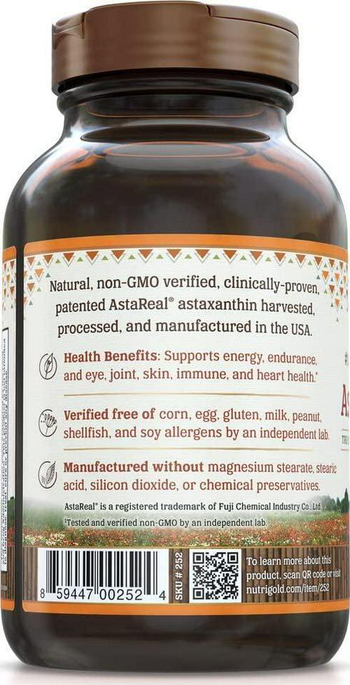 Astaxanthin Gold features a natural, pure source of astaxanthin extracted from Haematococcus pluvialis using a patented, supercritical, solvent-free process. The AstaReal extract used in Astaxanthin Gold is the world's most studied brand of astaxanthin, and aids skin, immune, and eye health. Astaxanthin Gold is manufactured in the USA to industry-defining quality standards and is verified by independent third-party labs to meet identity, purity, and potency label claims.