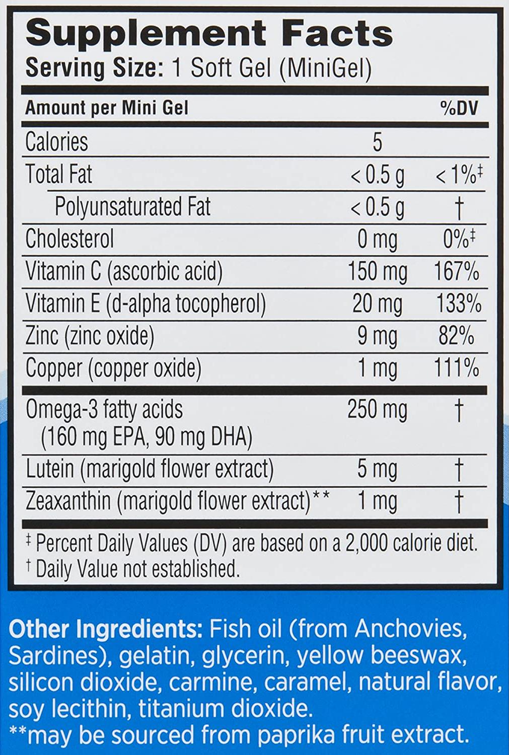 Ocuvite Eye Vitamin Adult 50+ Formula helps replenish essential eye protecting nutrients that you can lose as you age. This eye vitamin and mineral supplement contains antioxidants and nutrients, including Vitamin C, E, and Zinc, to help protect eye health. This Bausch and Lomb's advanced Ocuvite and Eye Vitamin Adult 50+ solf gels have been specially formulated to help replenish vital eye nutrients that are often not obtained in sufficient quantities through dieting alone. Lutein and Zeaxanthin helps to filter harmful blue light and support macular health. Omega-3 is essential nutrients that are important for proper retinal function. Bausch and Lomb's Ocuvite Eye Vitamin and Mineral Supplement for Adults 50+ is the doctor recommended 1 per day soft gel to improve eye health. Packaging may vary.