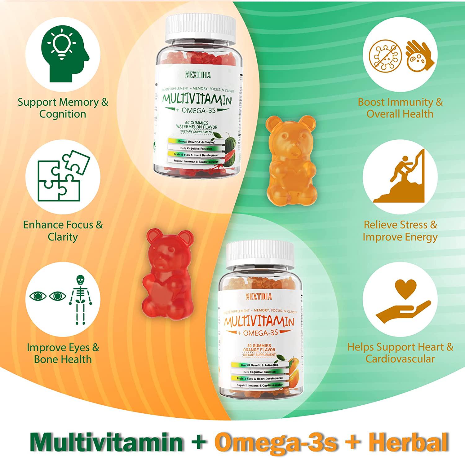 - ALL NATURAL + DELICIOUS TASTE: A pleasant alternative way for you to take the gummies as a dietary supplement, our omega 3 gummies with naturally watermelon flavored and naturally orange flavored not only do they taste good, but they help provide daily nutritional support. Without artificial colors or flavors, our yummy multivitamin supplement is safe for kids and adults.