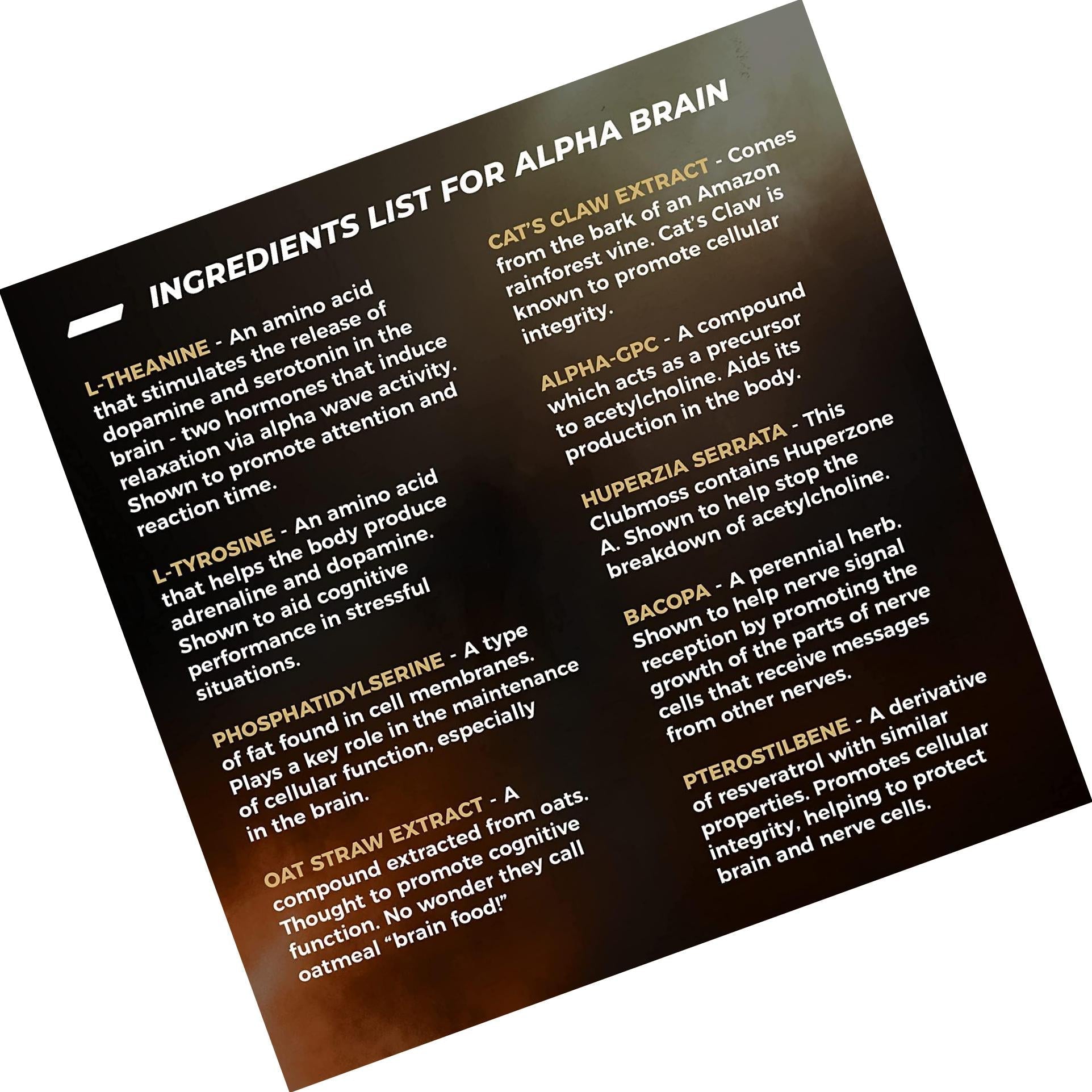 - EARTH-GROWN INGREDIENTS: Alpha Brain is crafted with earth-grown nutrients Bacopa, Cat's Claw, Oat Straw, and Huperzia Serrata to help you realize your limitless potential. For a complete list of ingredients, please see below.