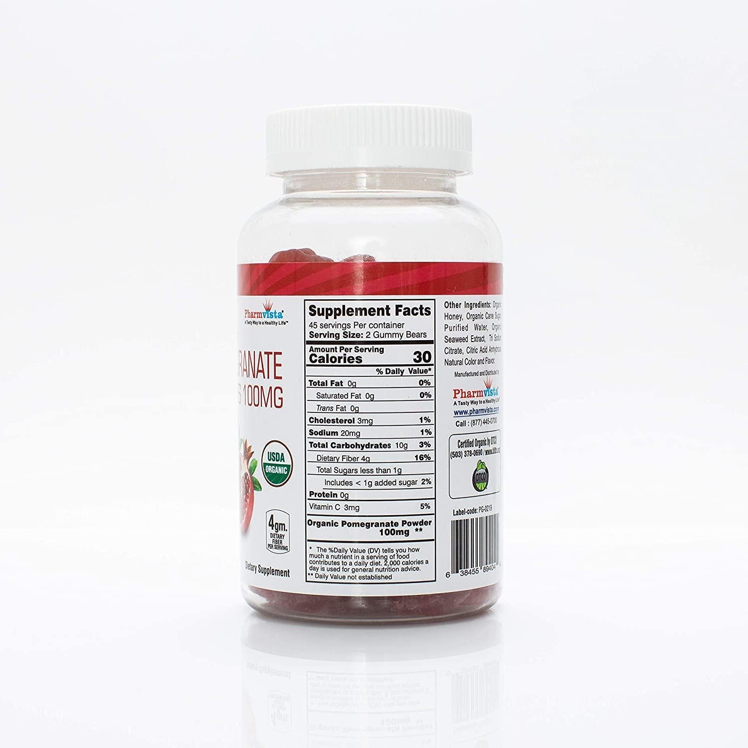 Organic Pomegranate Gummies is brought to you by a trusted manufacturer and brand - Pharmvista Inc. Our products are manufactured in an cGMP certified facility in USA. We only use natural and organic ingredients such as Organic Tapioca Syrup, Organic Cane Sugar etc. in our gummies*. Our gummies are Gelatin free, Gluten Free and 100% vegetarian.