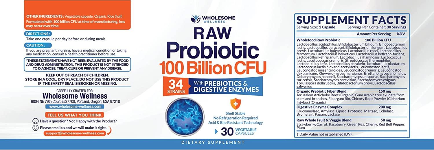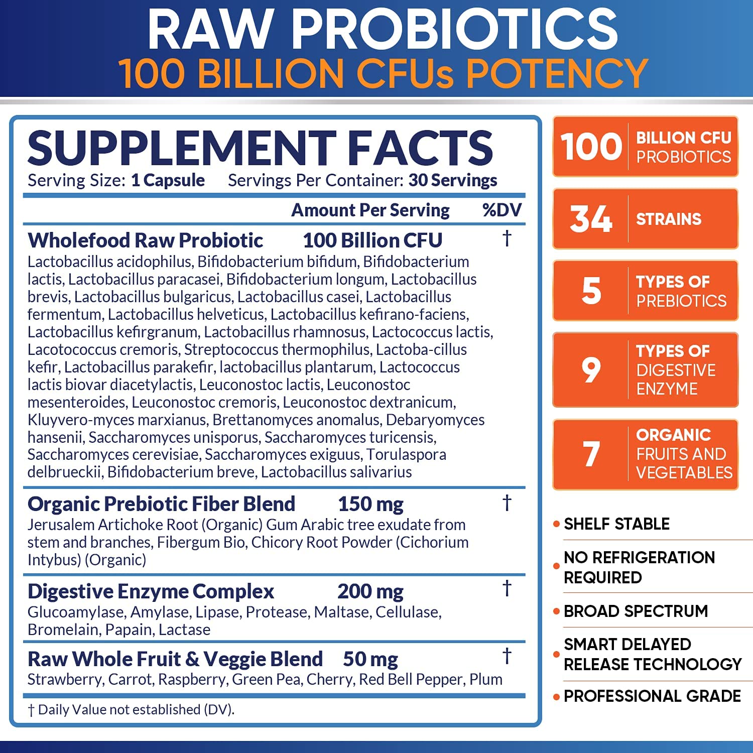 Raw Probiotics 100 Billion Probiotic is a Doctor-Approved 34 Strain Probiotic with Organic Prebiotics and digestive enzymes.