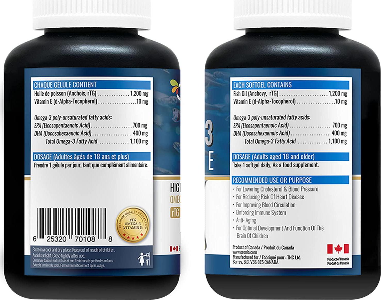 ORONIA rTG Omega 3 + Organic Vitamin E Soft Capsules - 180 Omega 3 Fish Oil with Vitamin E for Eye Health, Brain Growth and Development, Bone and Joint Health - 1100mg EPA and DHA - Made in Canada