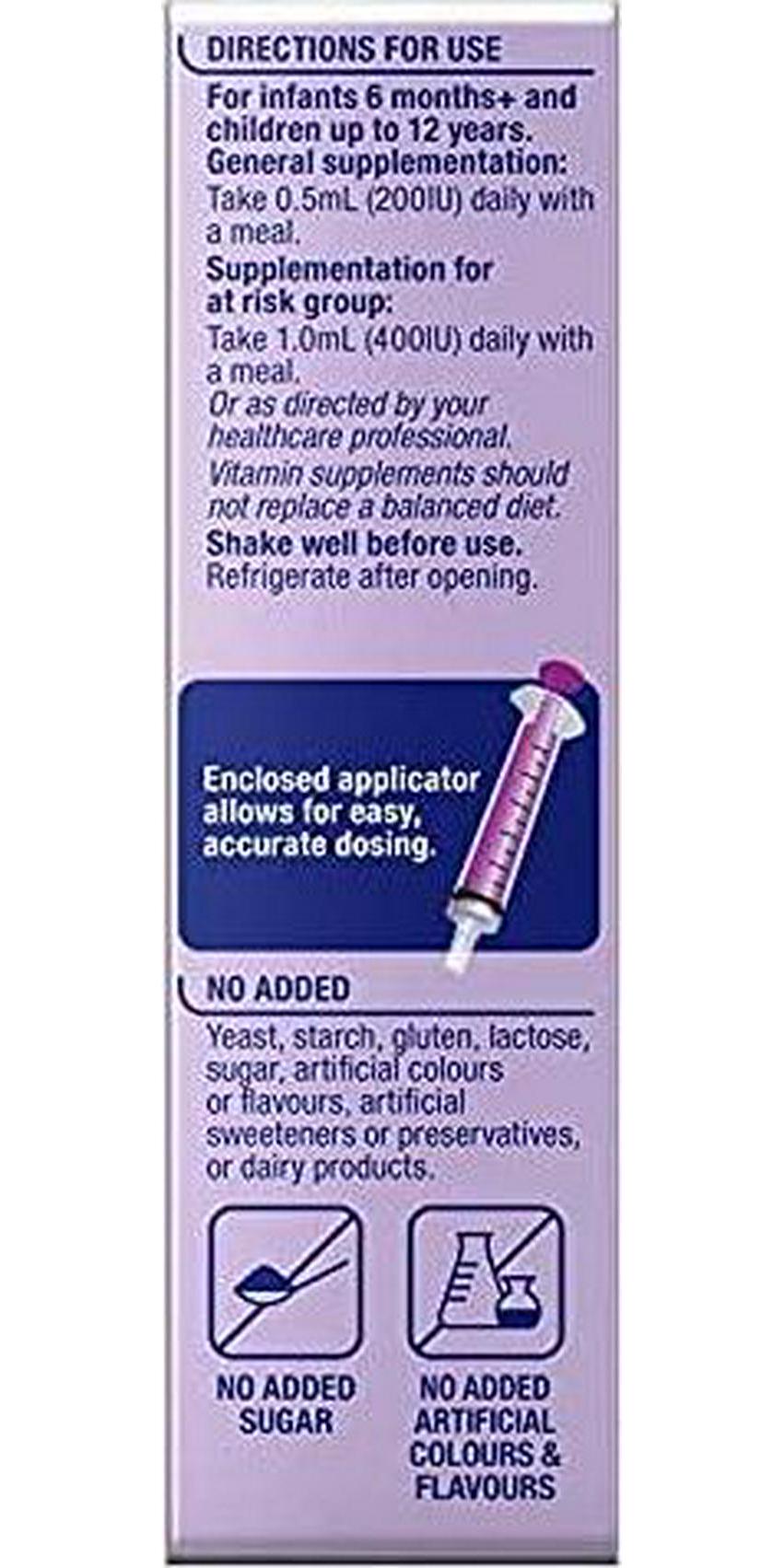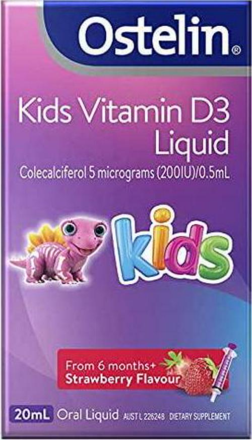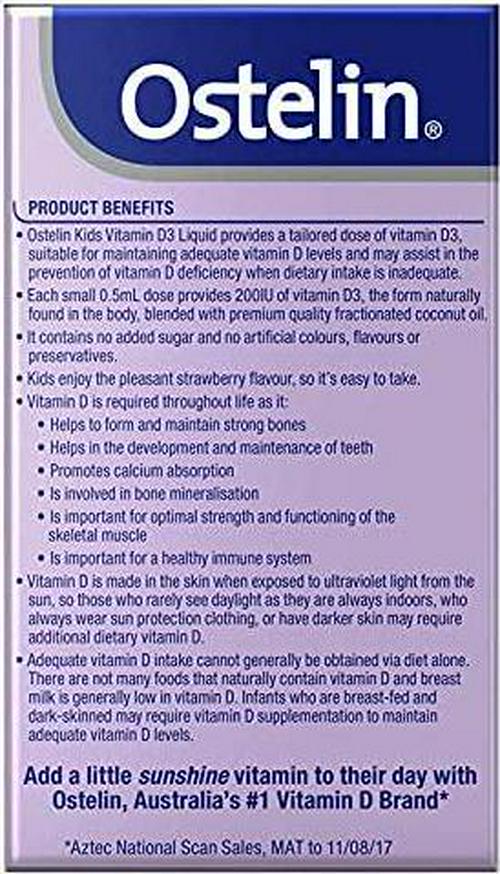 From Australia's #1 Vitamin D brand, Ostelin Vitamin D for Liquid Kids provides 200IU of Vitamin D3 per 0.5mL dose and includes an easy to use measuring dispenser ensuring accurate dose delivery. Available in a tasty strawberry flavour Ostelin Vitamin D Liquid Kids can be administered directly into the infant/child's mouth or added to their favourite drink. The Ostelin range is Halal accredited. How this product works Vitamin D is essential for efficient utilisation of calcium and phosphorous in the body which are vital for the production of strong bones and healthy nervous and immune systems. Ostelin Vitamin D Liquid for Kids is suitable as a prevention/treatment for vitamin D deficiency in those at increased risk. At increased risk are those mothers and children with darker skin, those who avoid sunlight or wear concealing clothing. Vitamin D is important for both lactating women and nursing infants. Infants who are breast-fed may require vitamin D supplementation to maintain adequate vitamin D levels. Vitamin D is needed for optimal bone mineralisation in children especially during times when sunlight exposure is limited. Ostelin contains Vitamin D3 which is the form that is produced naturally in the body. It contains no added sugar and no artificial colours or preservatives.