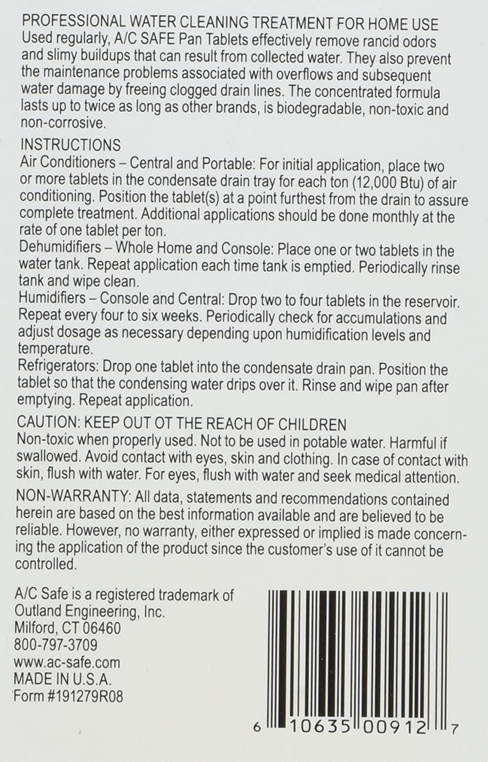 AIR CONDITIONER PAN CLEANER TABLETS Use for air conditioners, humidifiers, or refridgerators Cleans scum and other accumulations Eliminates plugged drains and pans Stops odors, overflows and water damage Non toxic Concentrated formula - use one tab per ton Clamshell