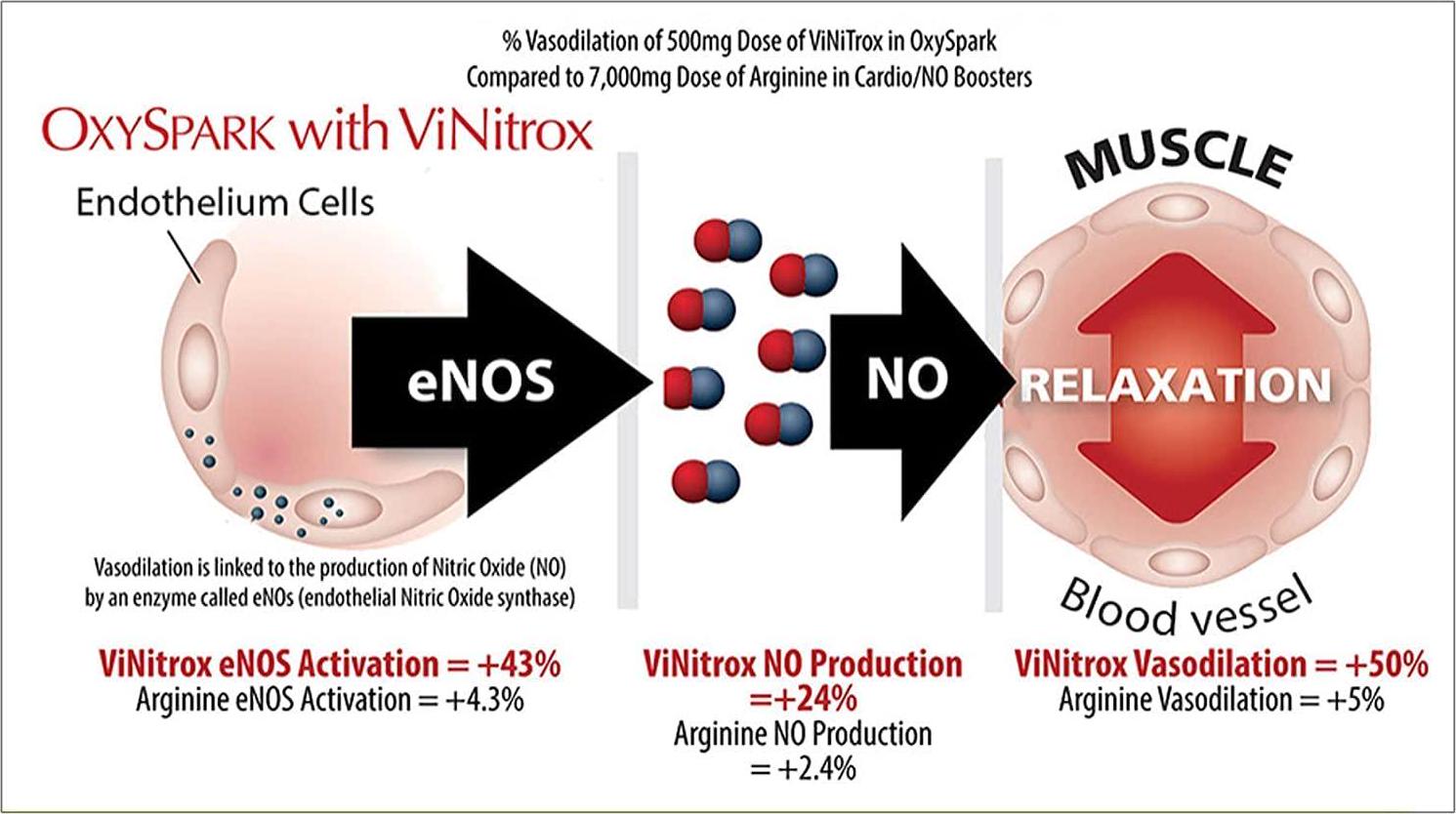 - Clinically Studied ViNitrox Active ingredient could be up to 10x more effective in Nitric Oxide production than Arginine and L-Arginine products. ViNitrox has shown up to 50% blood vessel dilation compared to a 5% increase by arginine.
