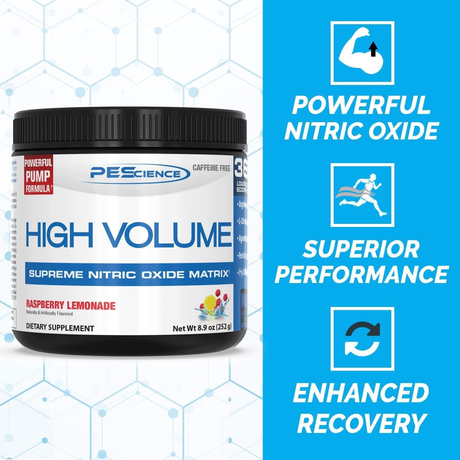 PEScience High Volume Nitric Oxide Booster Pre Workout Powder with L Arginine Nitrate, Raspberry Lemonade, 36 Scoops, Caffeine Free
