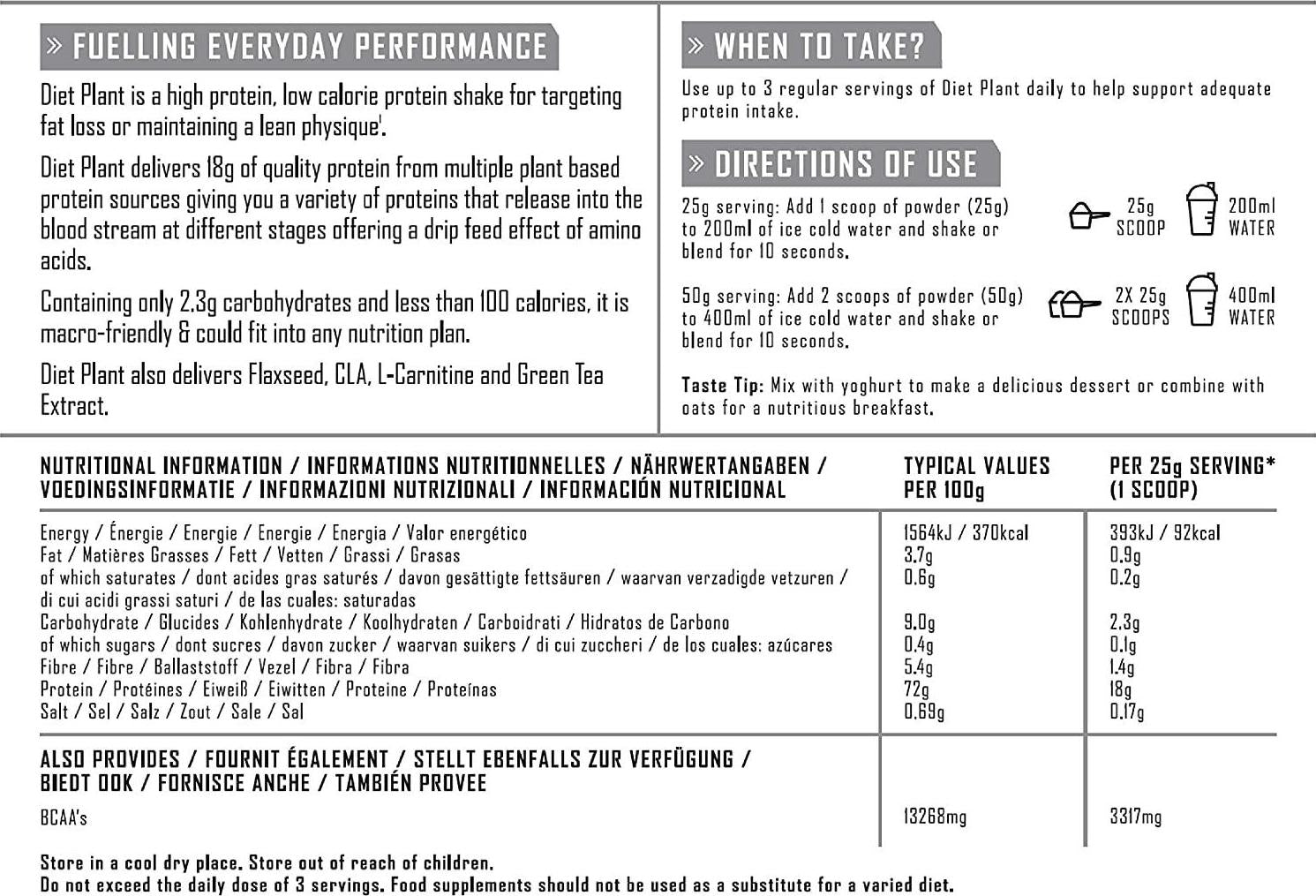 - Diet plant has the same great formulation as Diet whey, but replacing the milk and whey protein with plant protein
