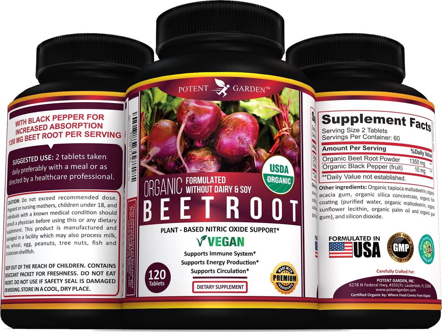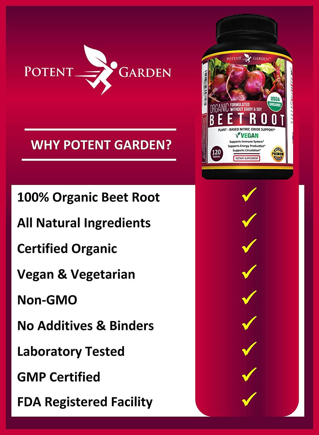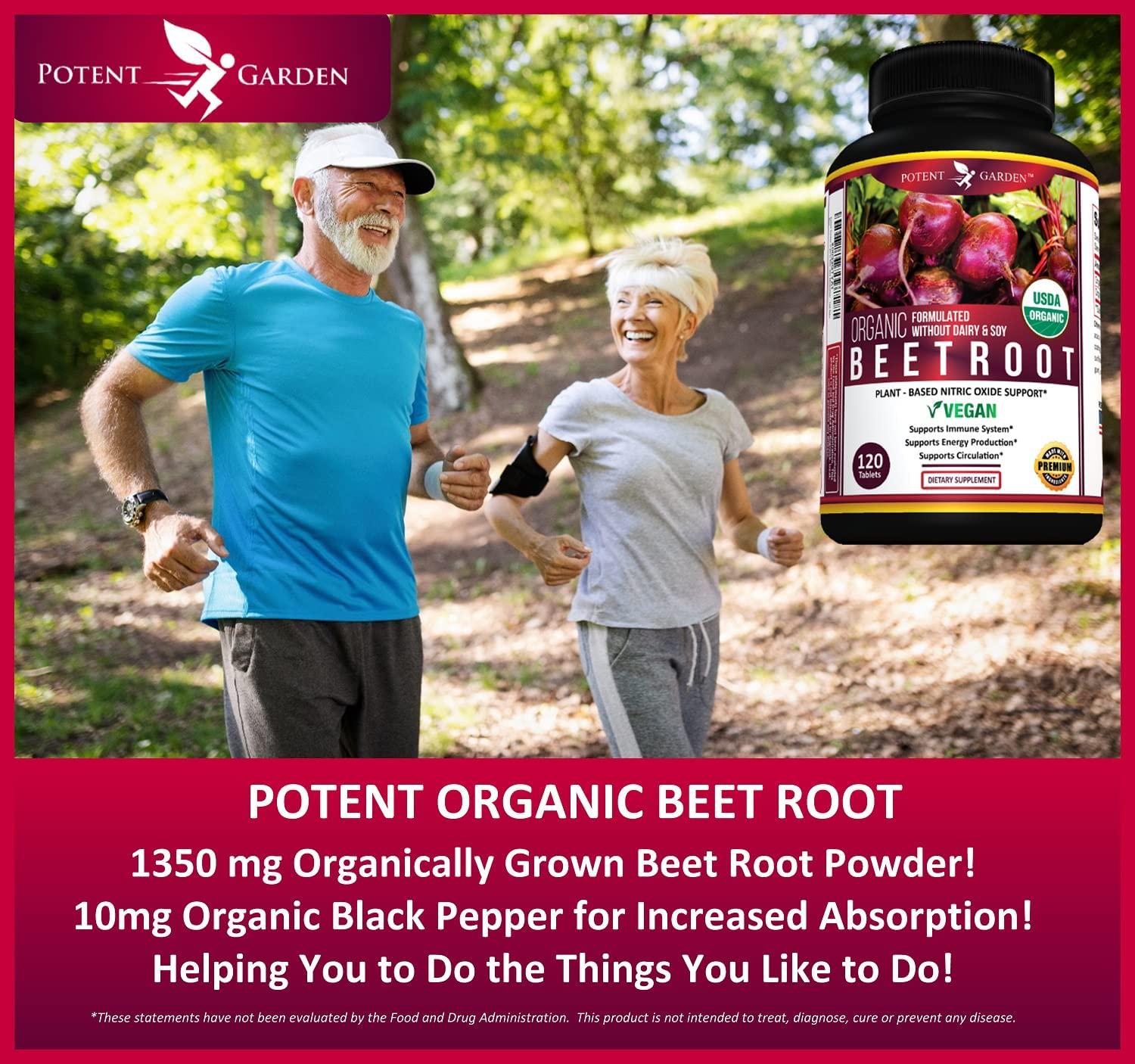 - POTENT ORGANIC BEET ROOT Helps support your body so you can stay active throughout the day. Potent Garden Organic Beets provides a two month supply of 120 tablets per bottle and 1350mg per serving. These USDA, beet root powder tabs are provided in a convenient easy-to-swallow supplement.
