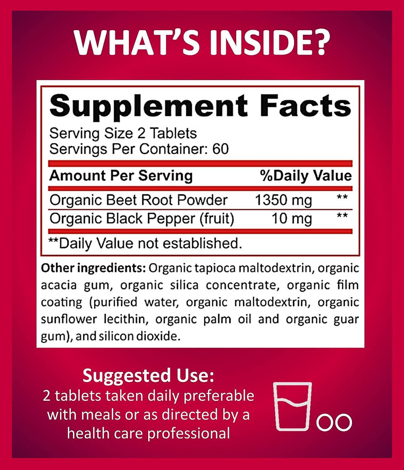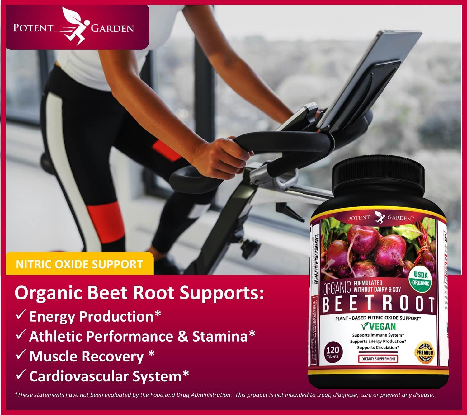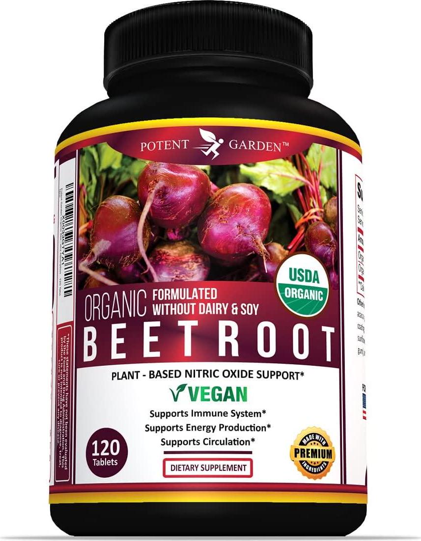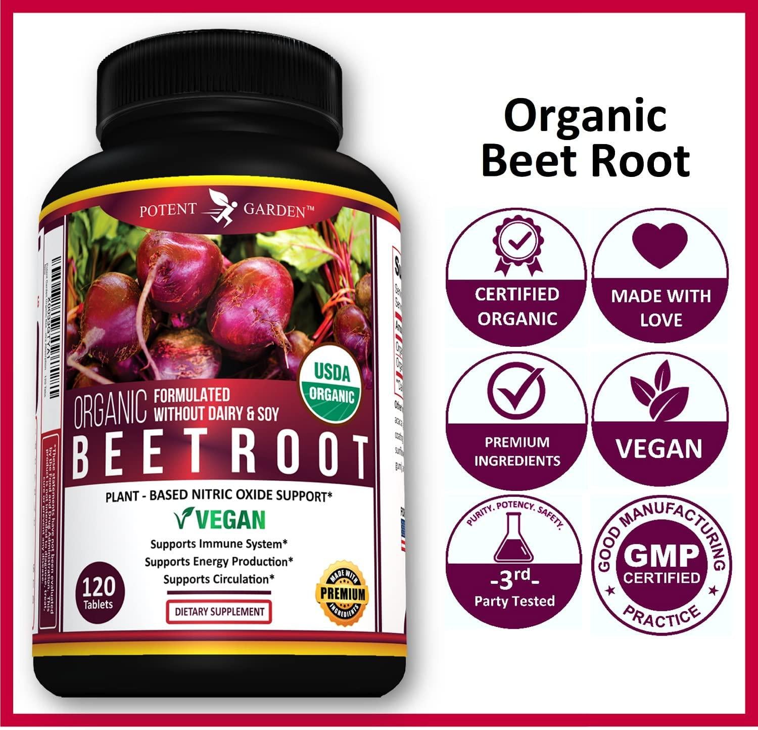 - POTENT ORGANIC BEET ROOT Helps support your body so you can stay active throughout the day. Potent Garden Organic Beets provides a two month supply of 120 tablets per bottle and 1350mg per serving. These USDA, beet root powder tabs are provided in a convenient easy-to-swallow supplement.