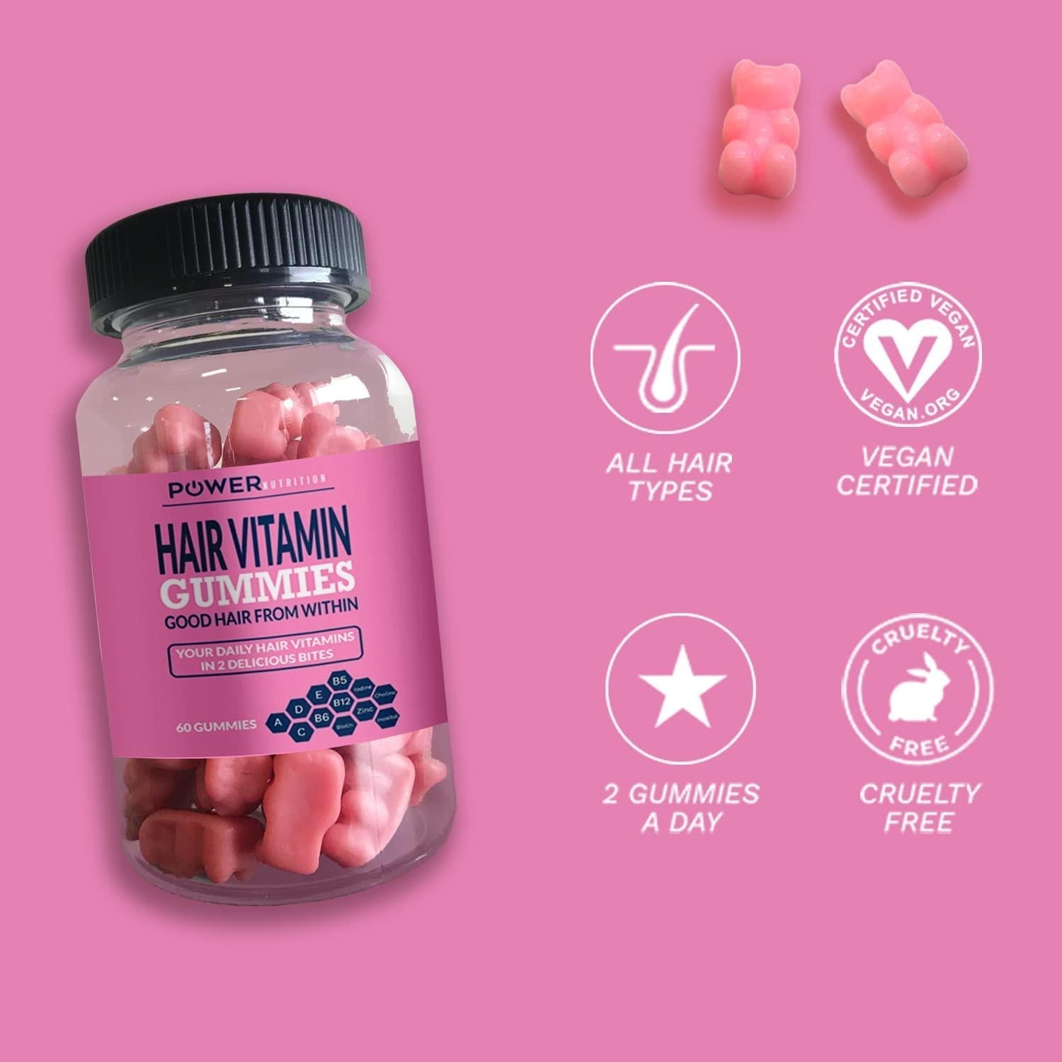 Power Nutrition Hair Vitamins Gummies with Biotin 5000 mcg Vitamin E and C Support Hair Growth, Premium Vegetarian, Non-GMO, for Stronger, Beautiful Hair and Nails, for Men and Women - 60 Gummy Bears