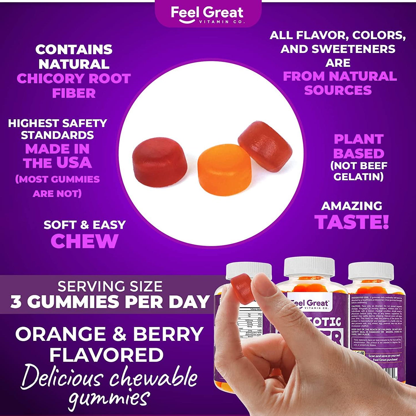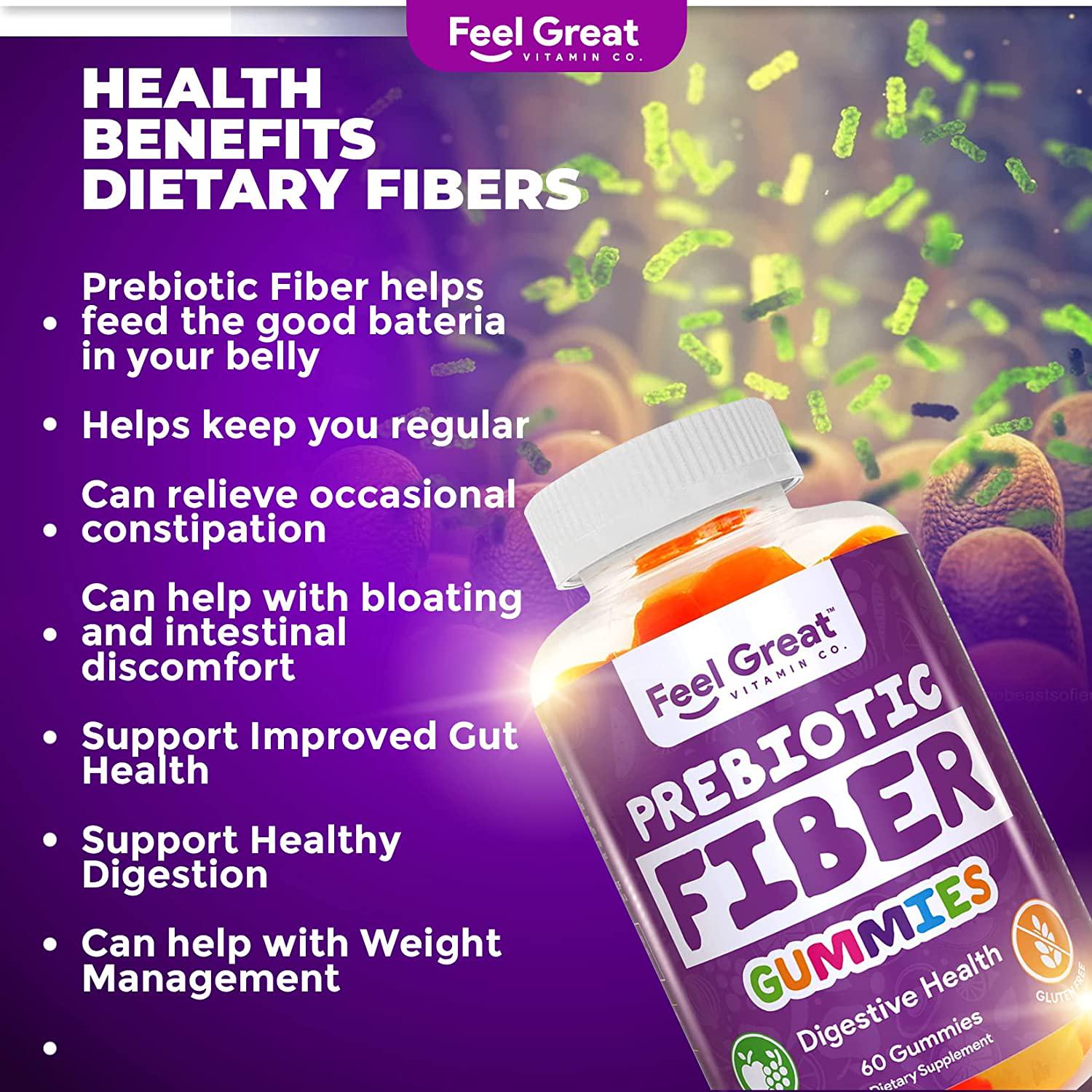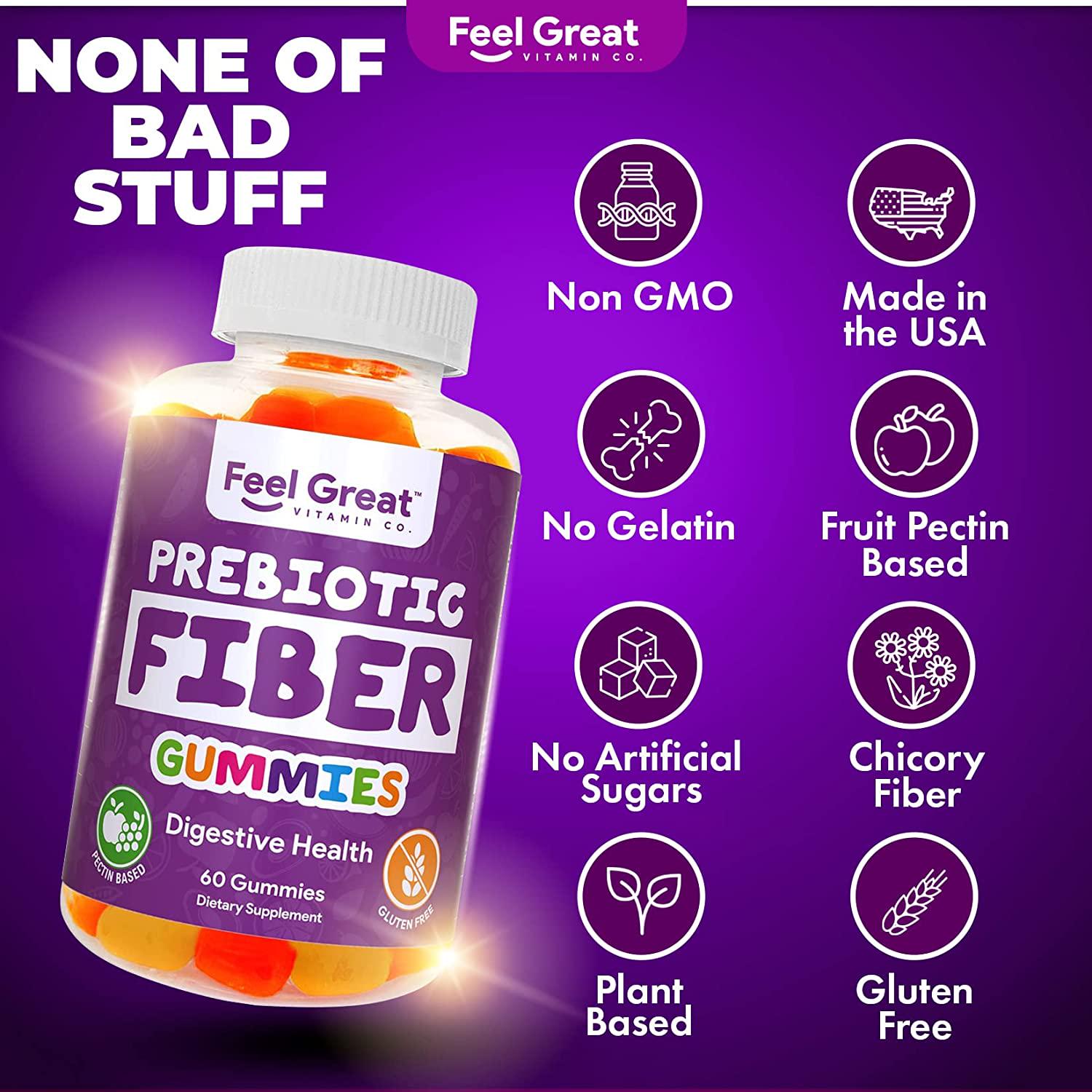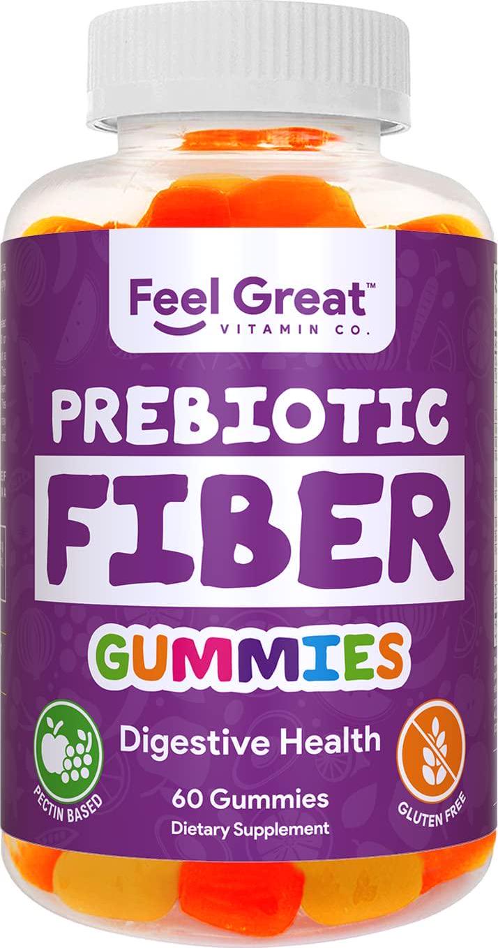 - Best Prebiotic Fiber Gummies. Feel Great Vitamin Co Prebiotic Fiber Gummies Vitamin Chews act as the food for the probiotics in our stomach and help with digestion and as a stool softener.