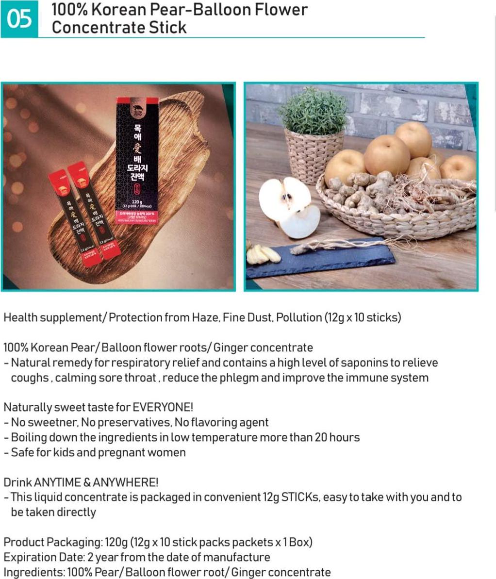 - INGREDIENTS: 100% Extract Products for Pear 52%, Balloon Floor 5%, Ginger 2%, Purified Water (Solid contents over 50%) 목애 배 도라지 진액