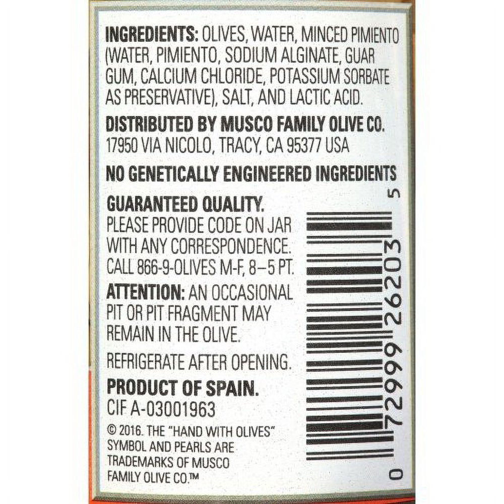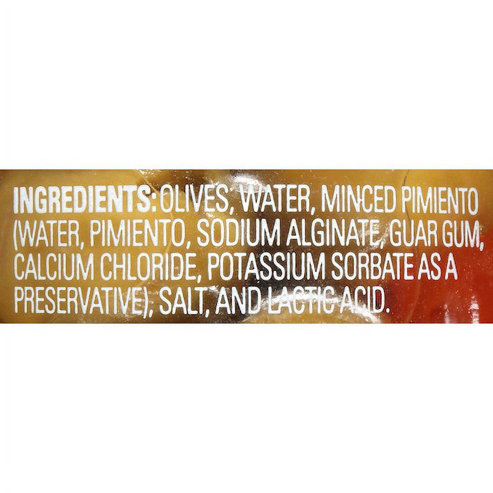 Olives, Water, Minced Pimiento (Water, Pimiento, Sodium Alginate, Guar Gum, Calcium Chloride, Potassium Sorbate As A Preservative), Salt, And Lactic Acid.