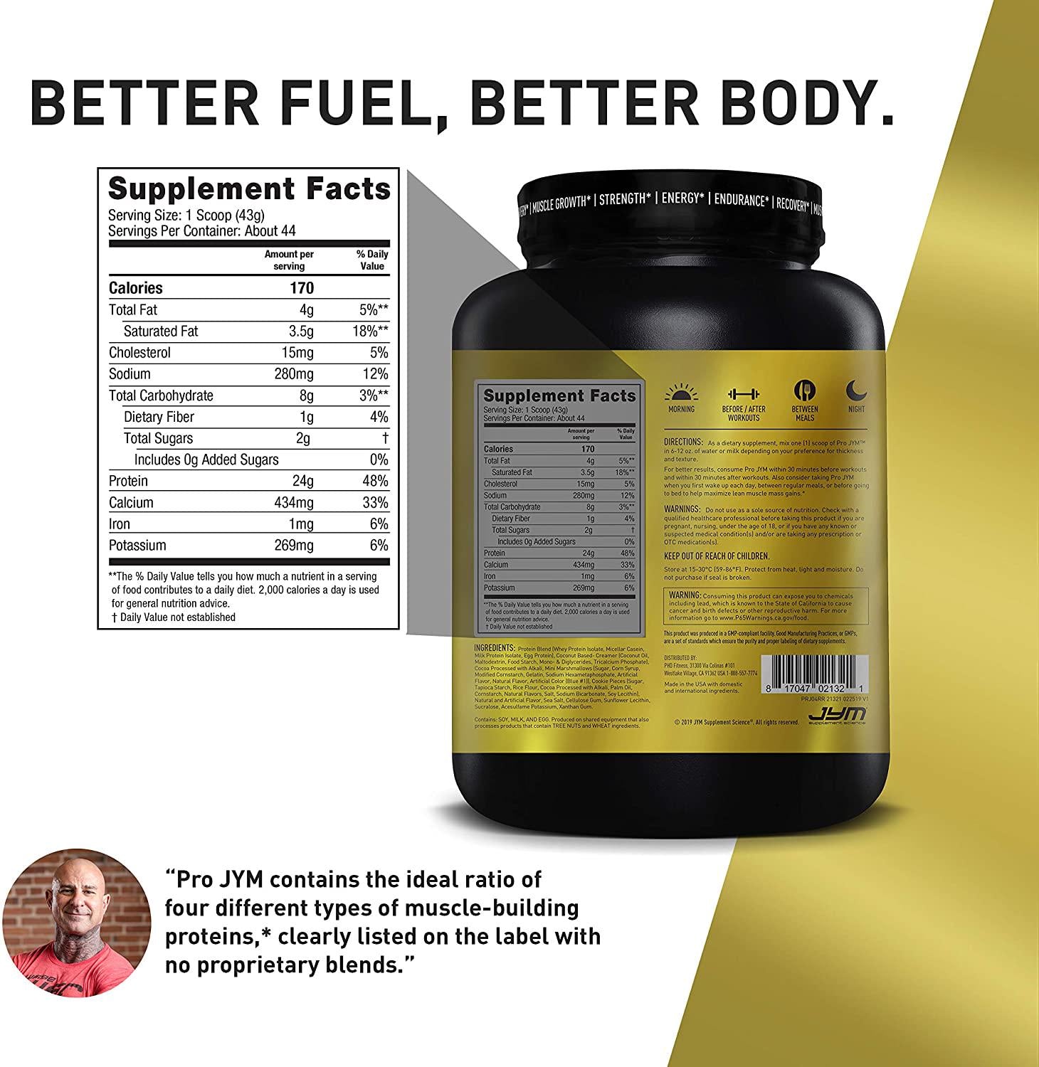 7.5g Whey protein isolate> 7g micellar casein> 7g milk protein isolate> 2.5g egg white proteinwhat sets It apart: aside from being a protein blend in a crowded market of sometimes under per forming 100% whey protein powders, Pro Jim is also a non-proprietary blend. A proprietary blend is any supplement that doesn't list the precise amount of every single active ingredient it contains. This isn't just prevalent with pre-workouts and fat-burners a lot of protein powders on the market are proprietary blends because they don't tell you the exact amounts of the proteins in the formula. Pro JYM, on the other hand, lists the exact amounts on the front of the container of all three types of proteins in their four distinct forms: whey protein isolate (7.5 grams), micellar casein (7 grams), egg albumen (2.5 grams) and milk protein isolate (7 grams 5.5 grams casein, 1.5 grams whey). nitrogen spiking (aka amino spiking or protein spiking) is an unscrupulous technique where some supplement companies put in less protein than what's listed on the label as a means of slashing costs and increasing their protein margins At the user's expense. Getting a spiked protein means paying for, say, 24 grams of protein but getting only 18 grams of actual whole proteins. With Pro JYM, you get all 24 grams, guaranteed. Pro Jim is not and never will be spiked with cheap fillers.