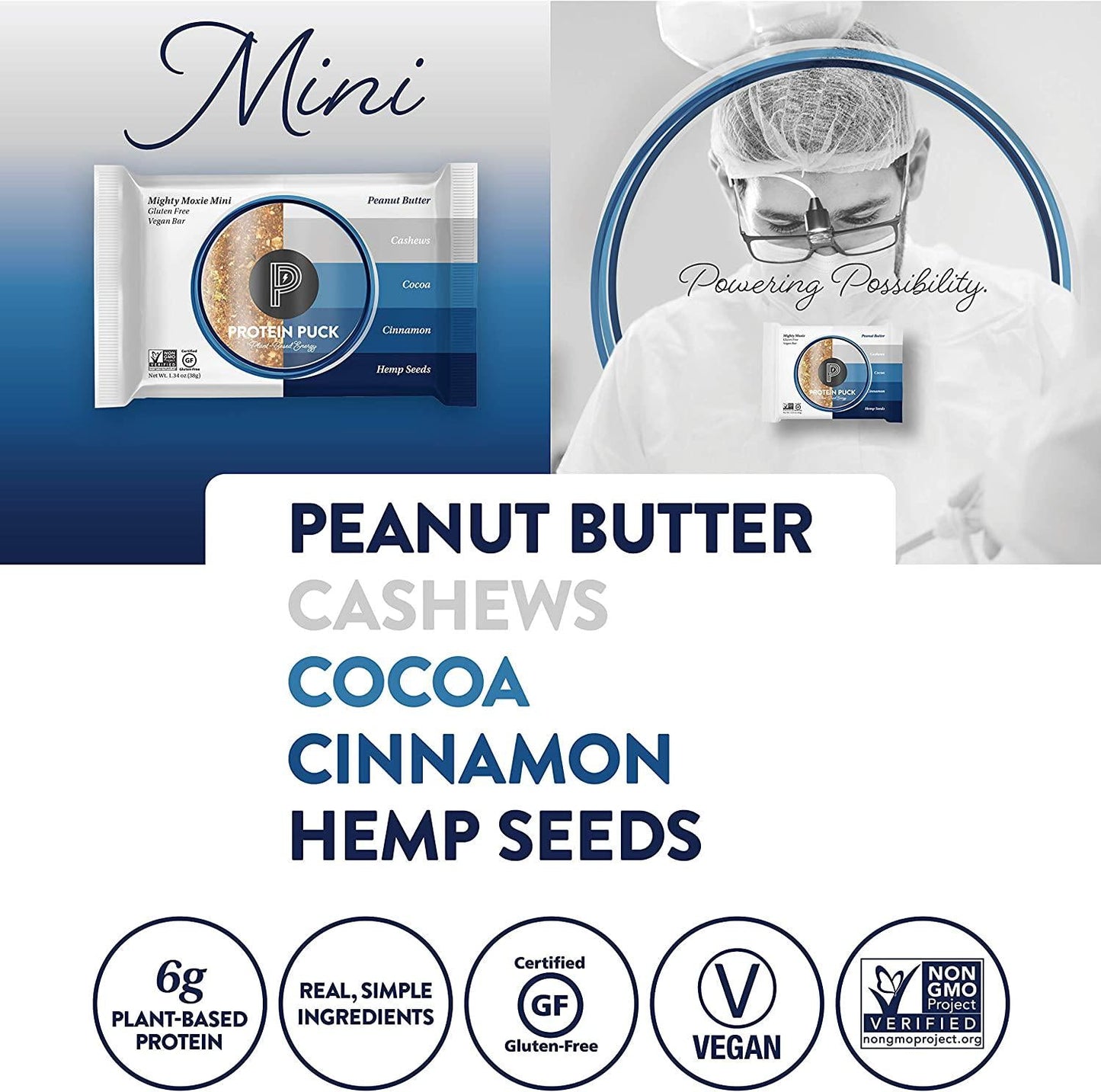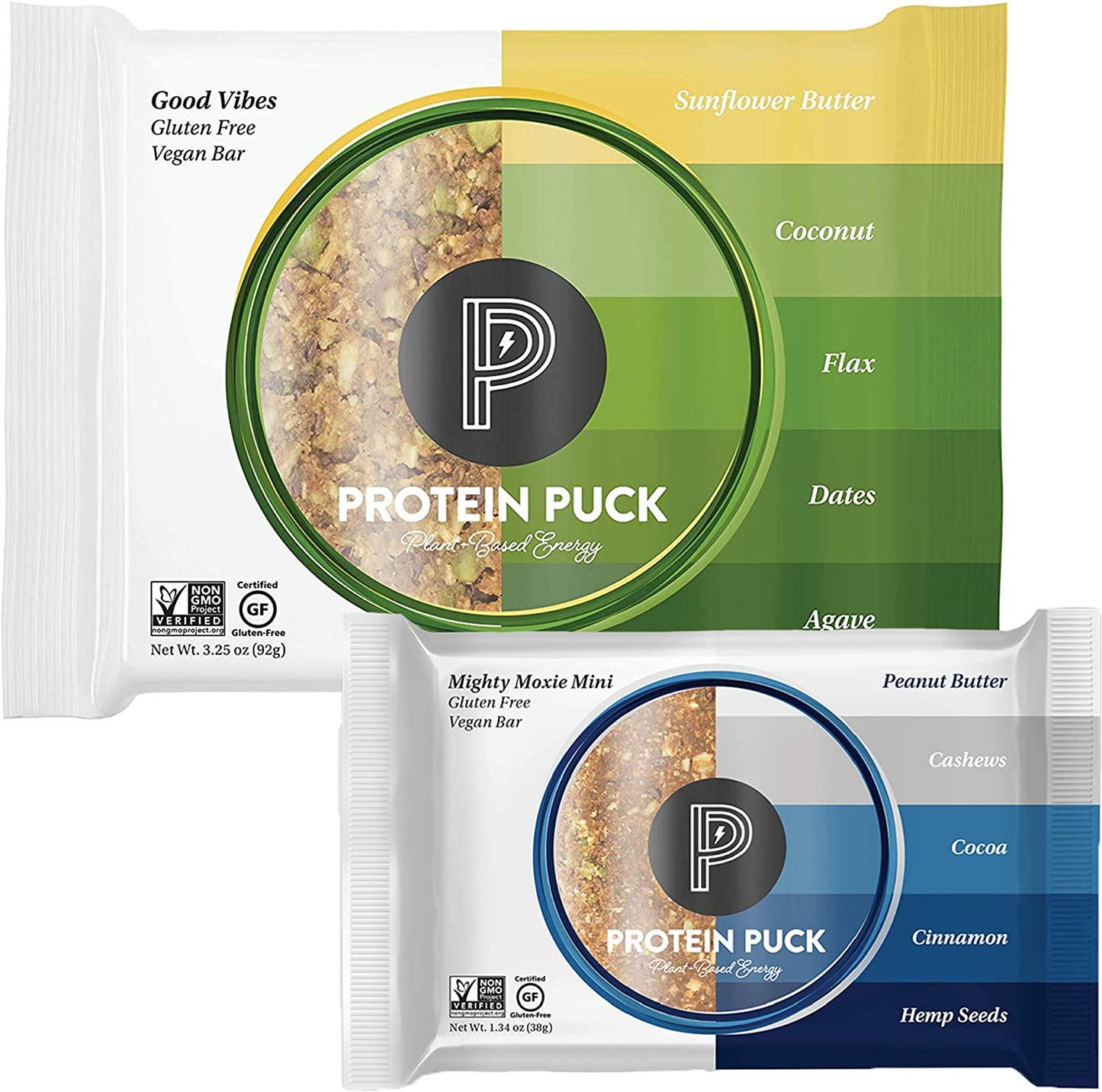 Protein Puck Value Bundle, Case of 12 Full Size Good Vibes + Case of 16 Mini Mighty Moxie - Plant-Based Bars, High Protein Snacks with Vegan Protein - Gluten-Free, Non-Dairy, Non-GMO Snack Bar