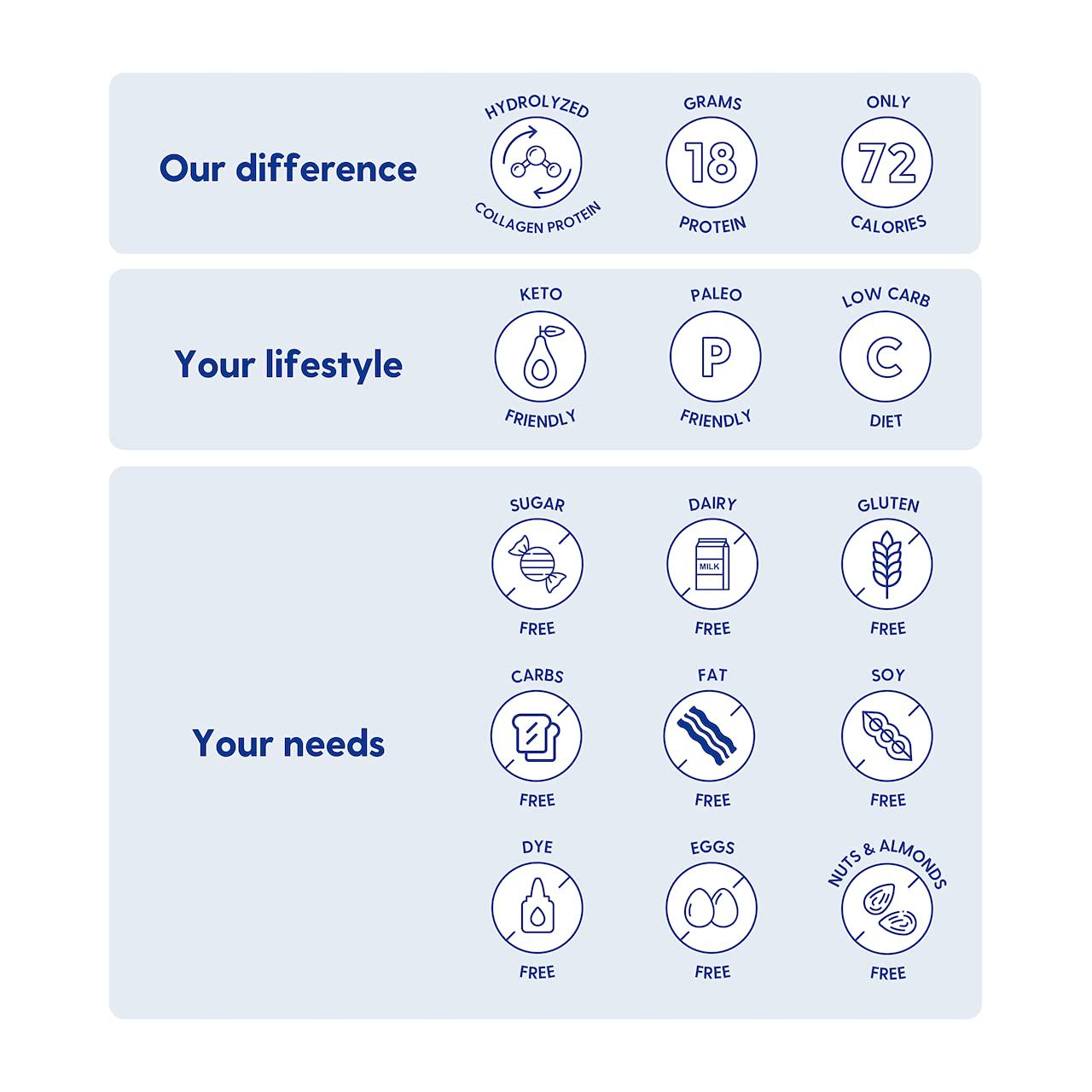 - KETO AND PALEO FRIENDLY: This lean source of liquid hydrolyzed protein contains 18g of protein and 18,000mg of collagen per serving, only 72 calories. Formulated with clean ingredients and only what your body needs, no proprietary blends, you can ensure that it has no carbs, fats, and sugars, GMO, gluten, as well as artificial dyes and preservatives.