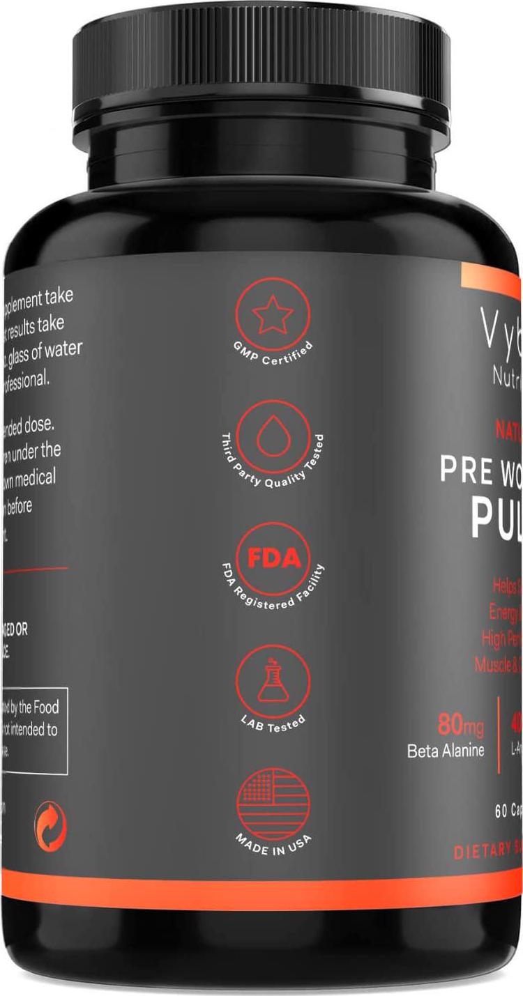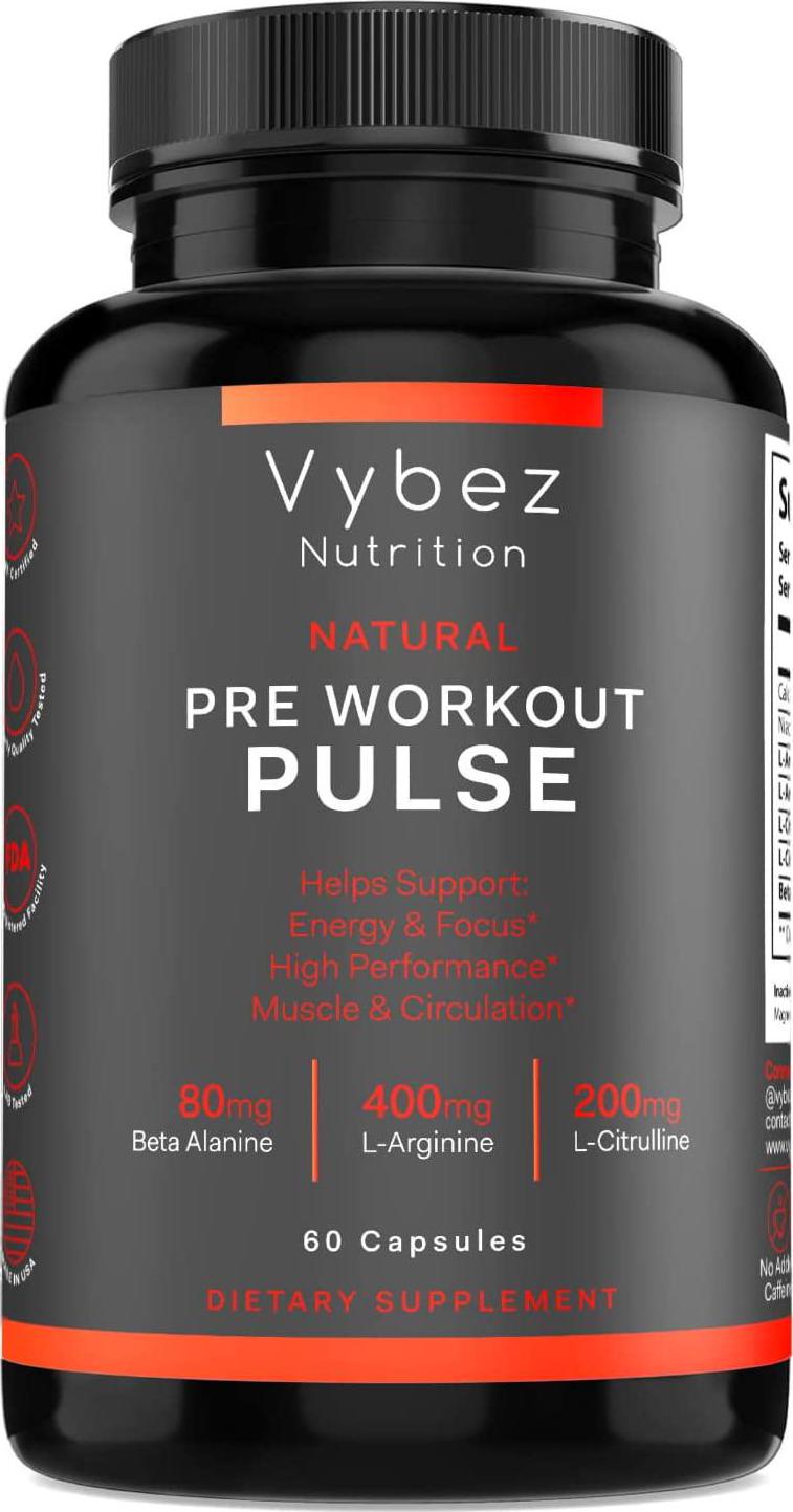 Pulse Pre-Workout Supplement, Stimulant Free - Caffeine Free Preworkout and Without Creatine, for Women and Men, with Beta Alanine, L-Citrulline and L-Arginine, 60 Capsules, Vybez Nutrition
