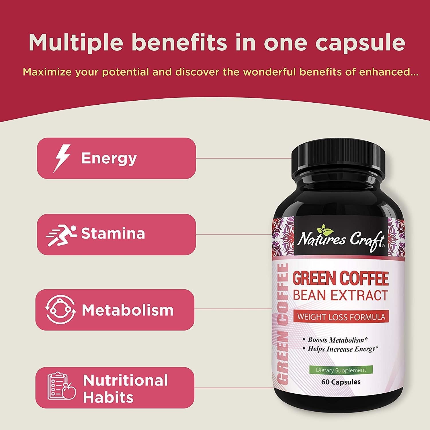 Green Coffee Bean by Natures Craft for Guaranteed Results or Your Money-back Scientifically Proven Results In 2012, the U.S. National Library of Medicine published a randomized, double blind, placebo-controlled study that evaluated the impact and safety of green coffee bean extract as a weight loss supplement. Over 12 weeks, participants lost an average of 17 pounds by taking GCA Green Coffee Bean Extract twice per day, making no other changes to their diet or exercise. On average, they lost 10% of their body weight and 16% of their total body fat. Moreover, they experienced no side effects of any kind. How Does It Work This product's weight loss effects are not caused by caffeine. Green Coffee Bean Extract only has approximately 20 mg of caffeine per serving, a cup of decaffeinated coffee. The key ingredient for weight loss is called chlorogenic acid.