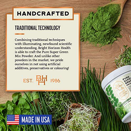 Pure Super Greens Powder Green Juice Powder with 7 Super Greens to Boost Energy, Digestion, pH Balance, Detox Natural, Healthy Superfood Powder Drink Mix by Bright Horizon Health, 8oz