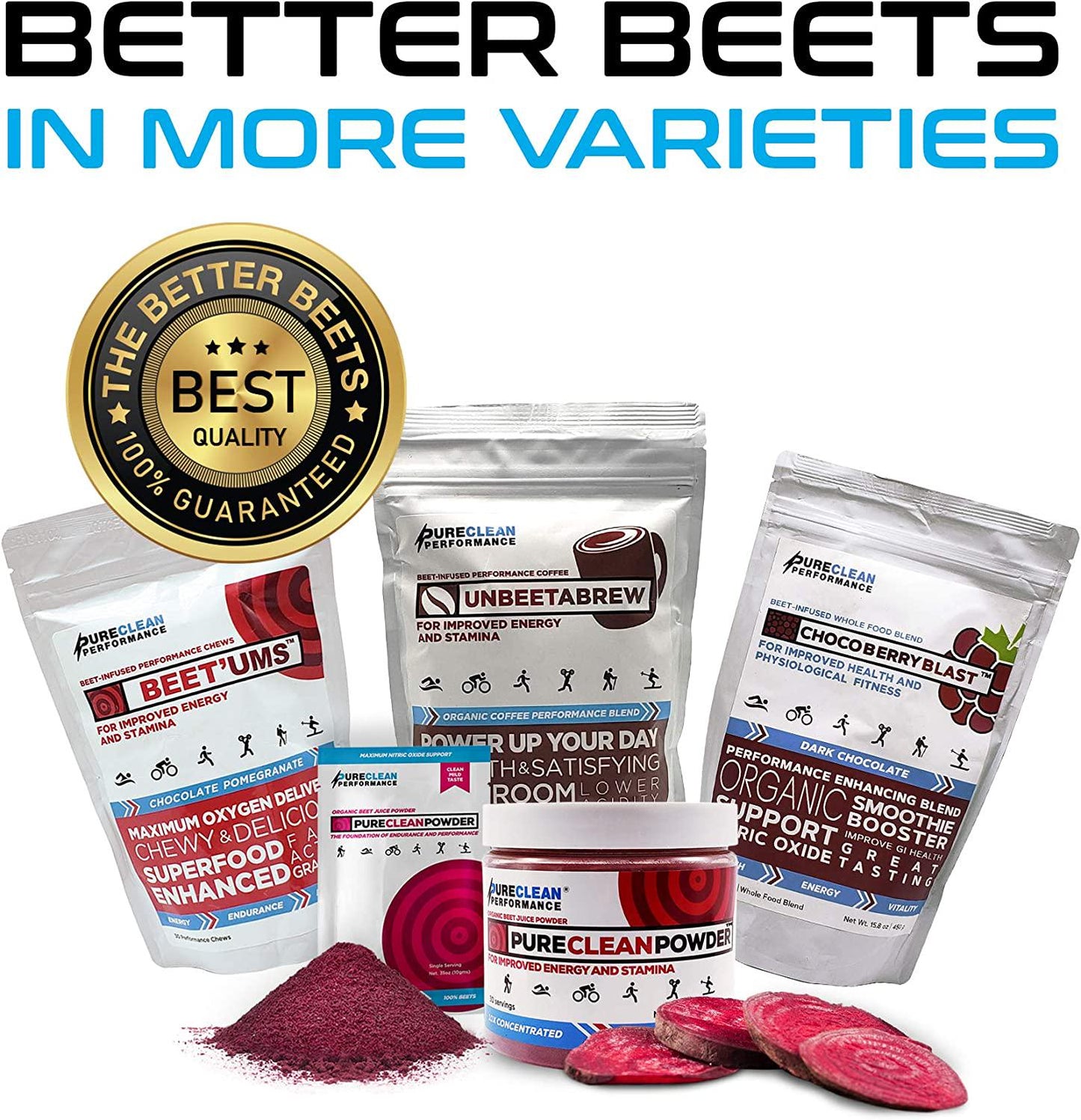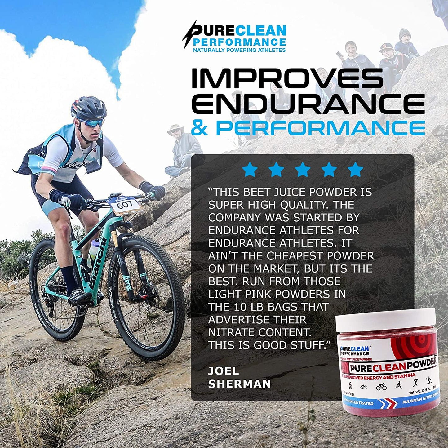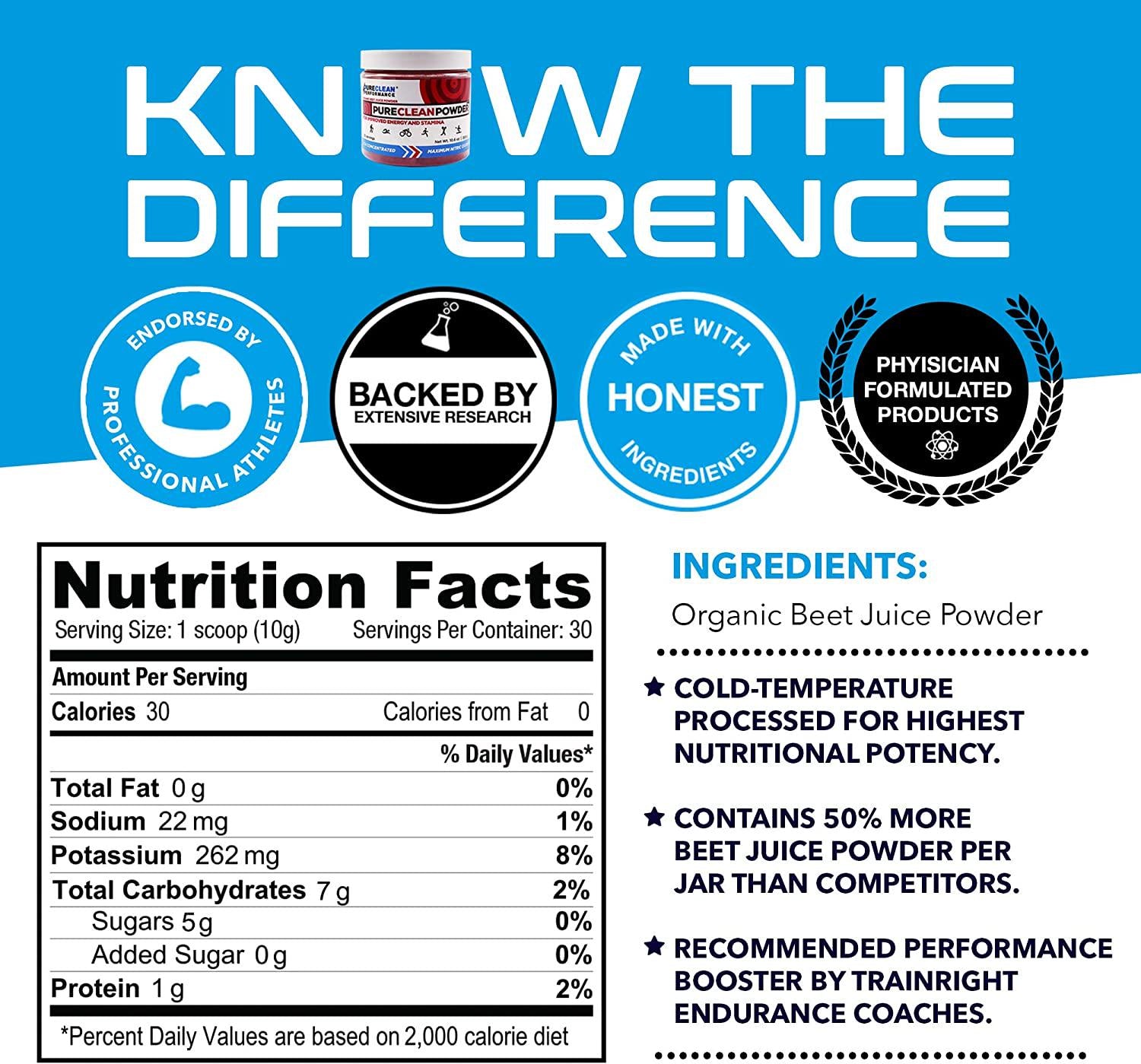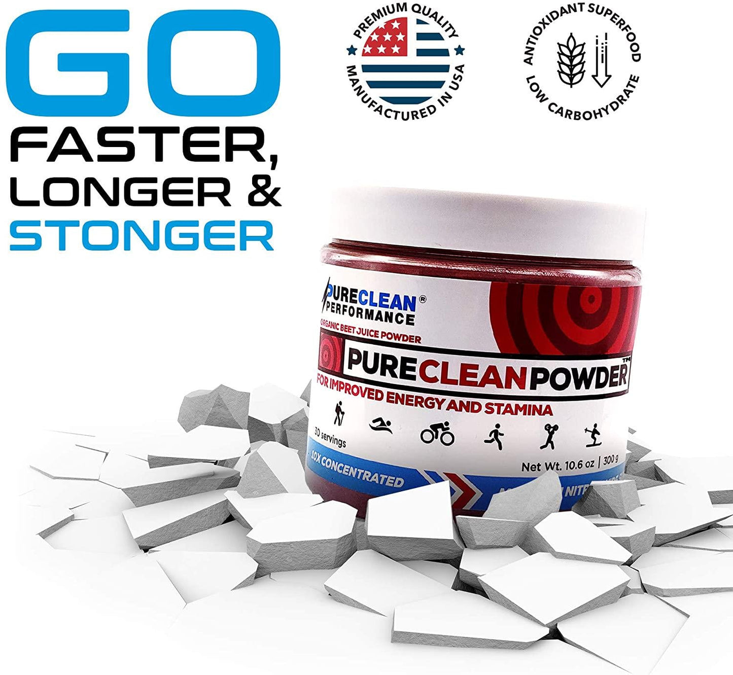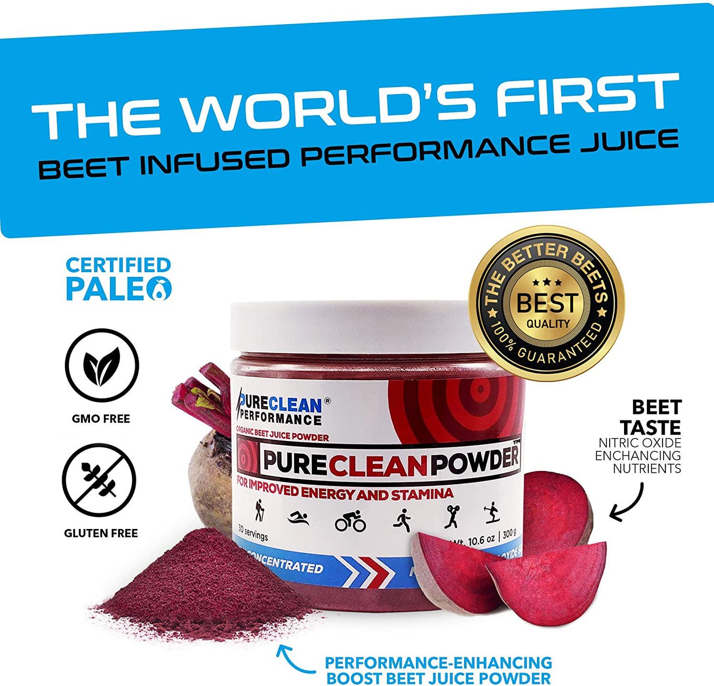 - PROVEN PERFORMANCE & ENDURANCE NUTRITION PureClean Powder 100 organic premium beet juice powder enhances energy endurance strength and speed. By naturally supporting the body s ability to produce and maintain high levels of nitric oxide it reduces an athlete s need for oxygen during exercise making a hard physical effort seem easier. In addition it helps by enhancing blood flow the regular use of PureClean Powder can reduce an athlete s recovery time after an intense training or racing effort.