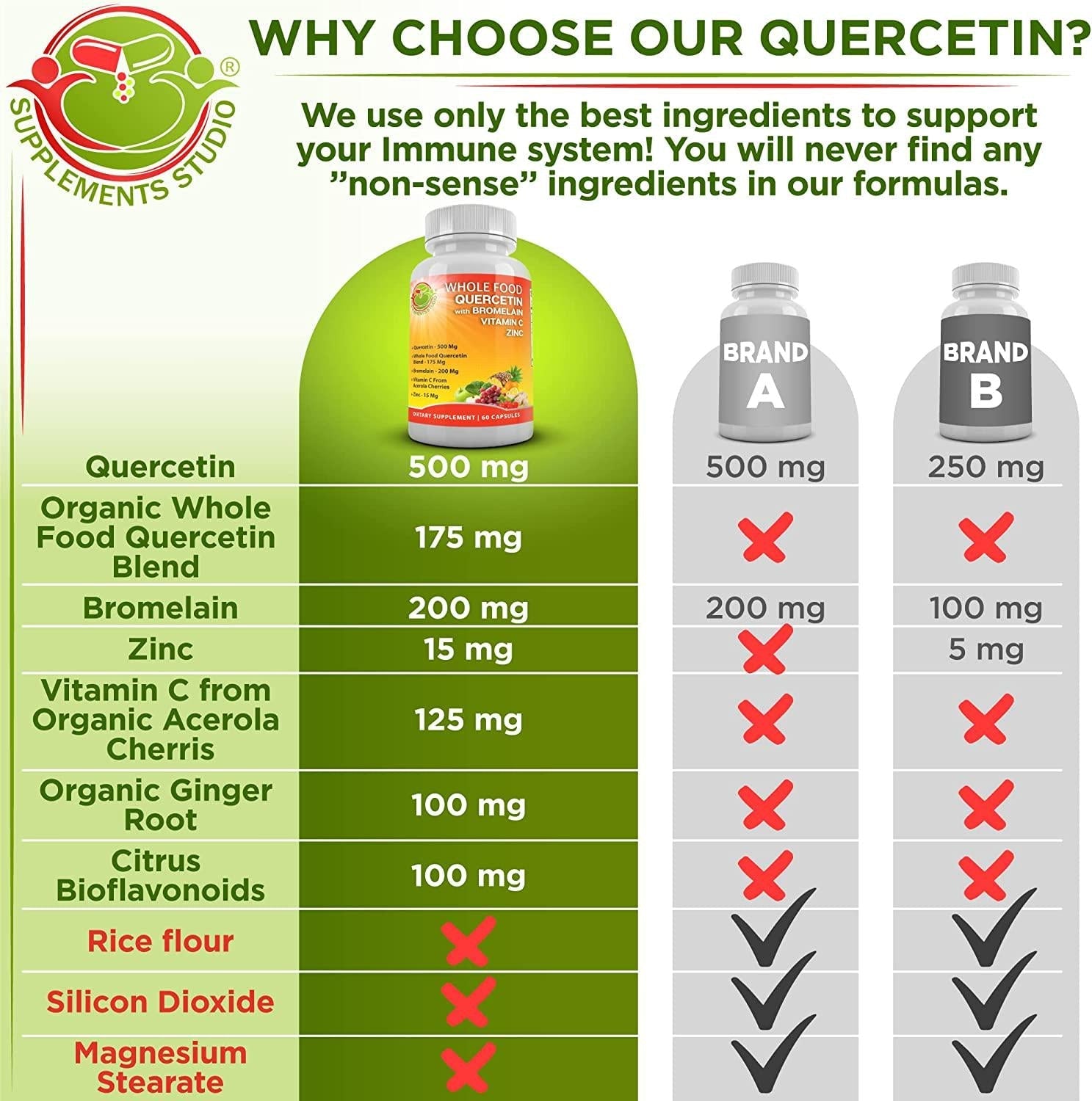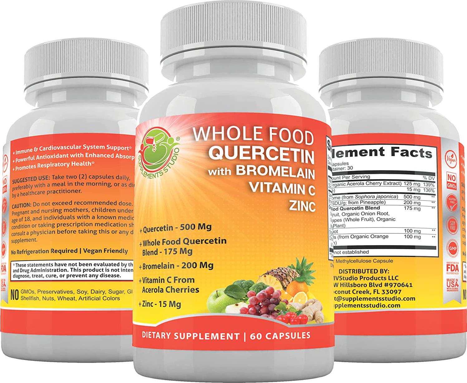 - HIGHEST QUALITY QUERCETIN PHYTOSOME WITH BROMELAIN COMPLEX - FORMULATED BY OUR TEAM OF EXPERTS: Our unique formula contains Quercetin 500 mg + 175 mg of an Organic Whole Food Quercetin Blend (sourced from raw fruits and veggies) + 15 mg of Zinc Picolinate + 200 mg of Bromelain from Pineapple + 100 mg of Organic Ginger Root + 125 mg of Vitamin C from Organic Acerola Cherries + 100 mg of Citrus Bioflavonoids from Organic Orange & Organic Lemon.