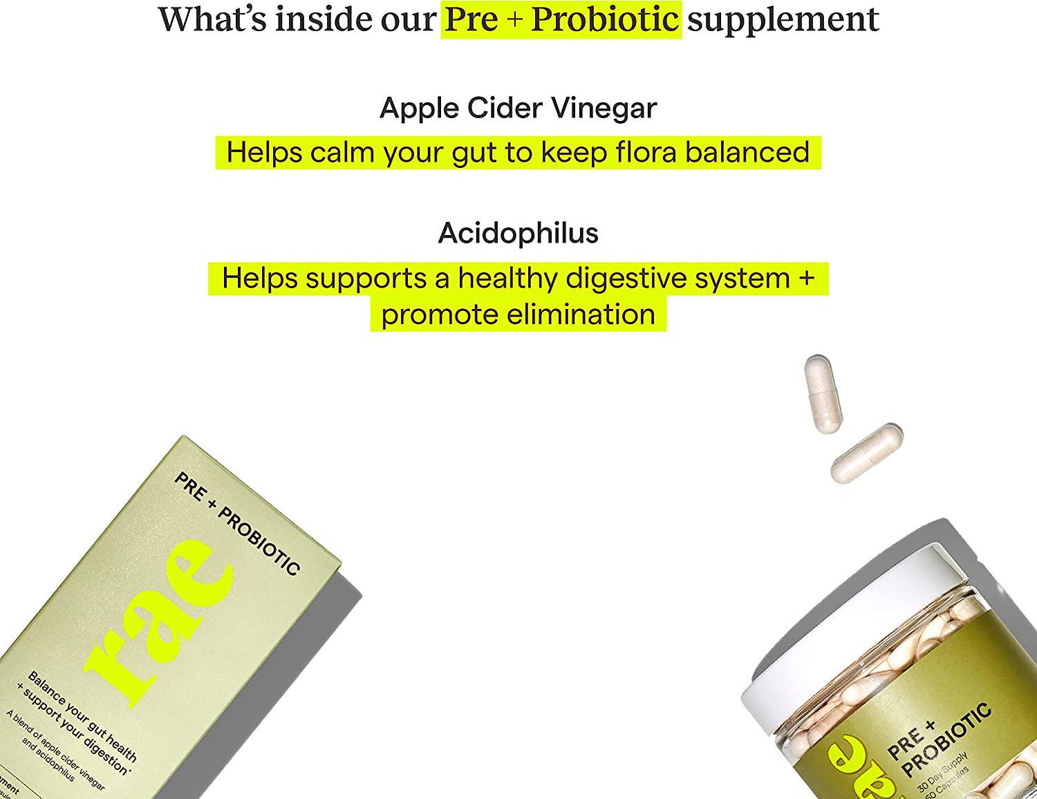 - GUT HEALTH + DIGESTION SUPPORT. Rae Pre+Probiotic Capsules are a blend of both probiotics and prebiotics including apple cider vinegar and acidophilus. This nutritional supplement supports a calm gut, aids healthy digestion and promotes elimination.